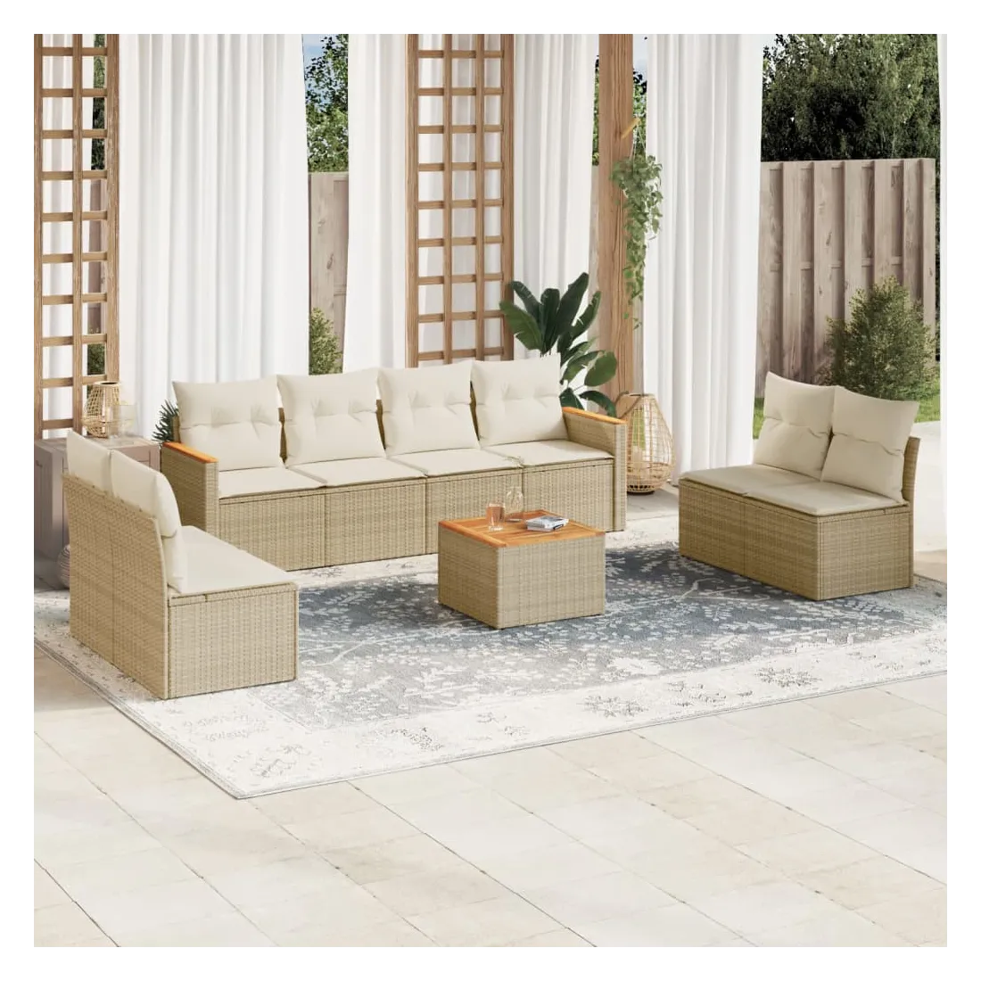 Cet ensemble de canapés de jardin est le complément parfait de votre arrière-cour, terrasse ou patio, offrant un espace confortable et accueillant pour discuter avec la famille et les amis ou simplement se détendre et profiter de l'extérieur. Matériau durable : la résine tressée, également connue sous le nom de poly rotin, est un matériau synthétique solide et nécessitant peu d'entretien qui ressemble au rotin naturel. Il est léger, facile à nettoyer et couramment utilisé pour les meubles d'extérieur en raison de sa durabilité et de ses propriétés de résistance aux intempéries.Expérience d'assise confortable : ce mobilier d'extérieur, doté de coussins épais, offre une expérience d'assise confortable.Dessus stable et facile à nettoyer : cette table de jardin a un dessus en bois d'acacia robuste, durable et facile à nettoyer avec un chiffon humide.Housse amovible et lavable : ces coussins de siège sont dotés de housses amovibles pour un lavage et un entretien faciles.Conception modulaire : cet ensemble de meubles d'extérieur a une conception modulaire, ce qui le rend complètement flexible et facile à déplacer, afin que vous puissiez créer un agencement de meubles d'extérieur personnalisé. Bon à savoir :Pour que vos meubles d'extérieur restent beaux, nous vous recommandons de les protéger avec une housse imperméable.