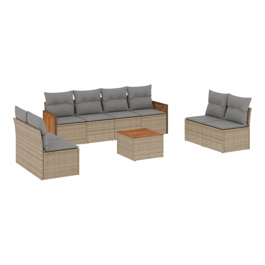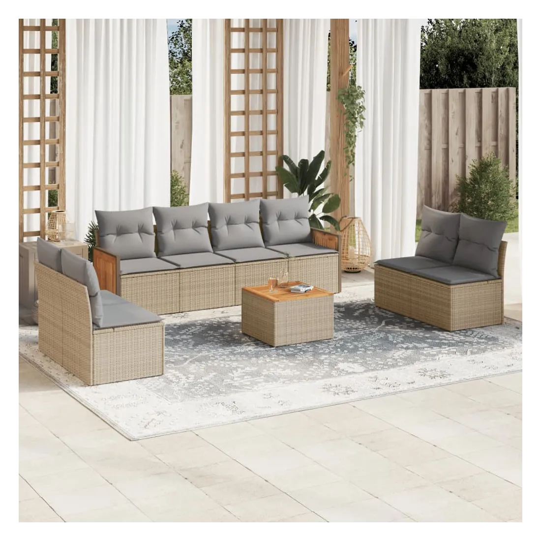 Cet ensemble de canapés de jardin est le complément parfait de votre arrière-cour, terrasse ou patio, offrant un espace confortable et accueillant pour discuter avec la famille et les amis ou simplement se détendre et profiter de l'extérieur. Matériau durable : la résine tressée, également connue sous le nom de poly rotin, est un matériau synthétique solide et nécessitant peu d'entretien qui ressemble au rotin naturel. Il est léger, facile à nettoyer et couramment utilisé pour les meubles d'extérieur en raison de sa durabilité et de ses propriétés de résistance aux intempéries.Expérience d'assise confortable : ce mobilier d'extérieur, doté de coussins épais, offre une expérience d'assise confortable.Dessus stable et facile à nettoyer : cette table de jardin a un dessus en bois d'acacia robuste, durable et facile à nettoyer avec un chiffon humide.Housse amovible et lavable : ces coussins de siège sont dotés de housses amovibles pour un lavage et un entretien faciles.Conception modulaire : cet ensemble de meubles d'extérieur a une conception modulaire, ce qui le rend complètement flexible et facile à déplacer, afin que vous puissiez créer un agencement de meubles d'extérieur personnalisé. Bon à savoir :Pour que vos meubles d'extérieur restent beaux, nous vous recommandons de les protéger avec une housse imperméable.