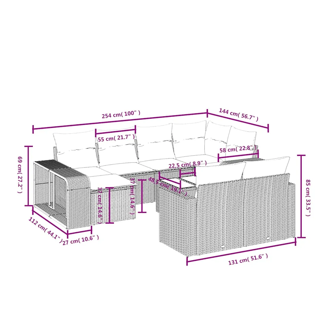 - Dimensions (L) : 112 x 27 x 55 cm (L x l x H)