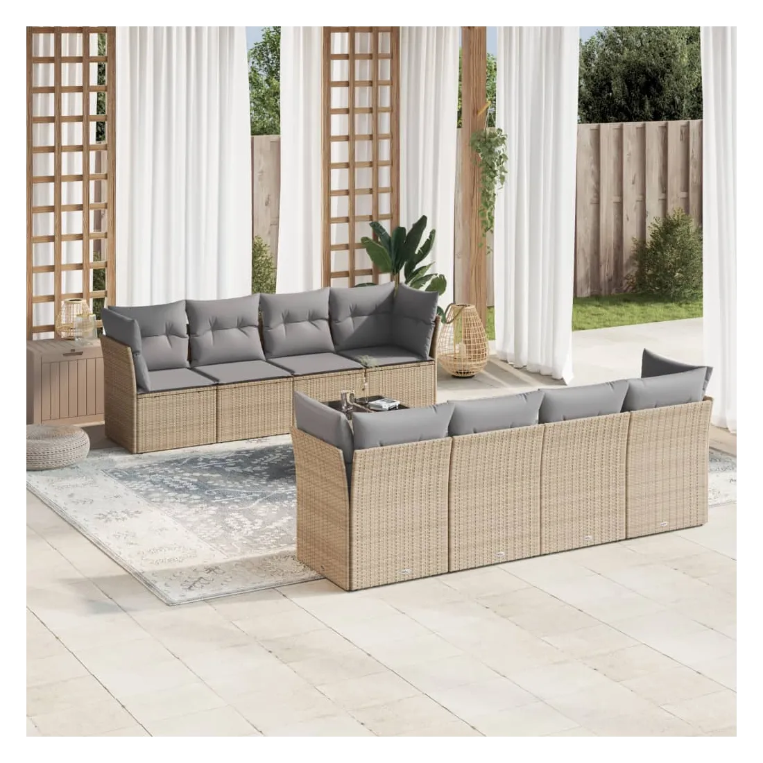 Cet ensemble de canapés de jardin est le complément parfait de votre arrière-cour, terrasse ou patio, offrant un espace confortable et accueillant pour discuter avec la famille et les amis ou simplement se détendre et profiter de l'extérieur. Matériau durable : la résine tressée, également connue sous le nom de poly rotin, est un matériau synthétique solide et nécessitant peu d'entretien qui ressemble au rotin naturel. Il est léger, facile à nettoyer et couramment utilisé pour les meubles d'extérieur en raison de sa durabilité et de ses propriétés de résistance aux intempéries.Fonction de rangement avec sac résistant à l'eau : chaque siège de jardin dispose d'un espace de rangement sous l'assise, complété par un sac résistant à l'eau pour ranger les coussins, les jouets et d'autres objets. Les sacs intérieurs sont dotés d'un couvercle et peuvent être solidement fixés aux sièges à l'aide de bandes auto-agrippantes pour plus de stabilité.Dessus en verre : le dessus de la table d'extérieur est fabriqué en verre trempé solide et durable, ce qui le rend facile à nettoyer avec un chiffon humide et ajoute une touche d'élégance à votre espace extérieur.Housse amovible et lavable : ces coussins de siège sont dotés de housses amovibles pour un lavage et un entretien faciles.Conception modulaire : cet ensemble de meubles d'extérieur a une conception modulaire, ce qui le rend complètement flexible et facile à déplacer, afin que vous puissiez créer un agencement de meubles d'extérieur personnalisé. Bon à savoir :Pour que vos meubles d'extérieur restent beaux, nous vous recommandons de les protéger avec une housse imperméable.