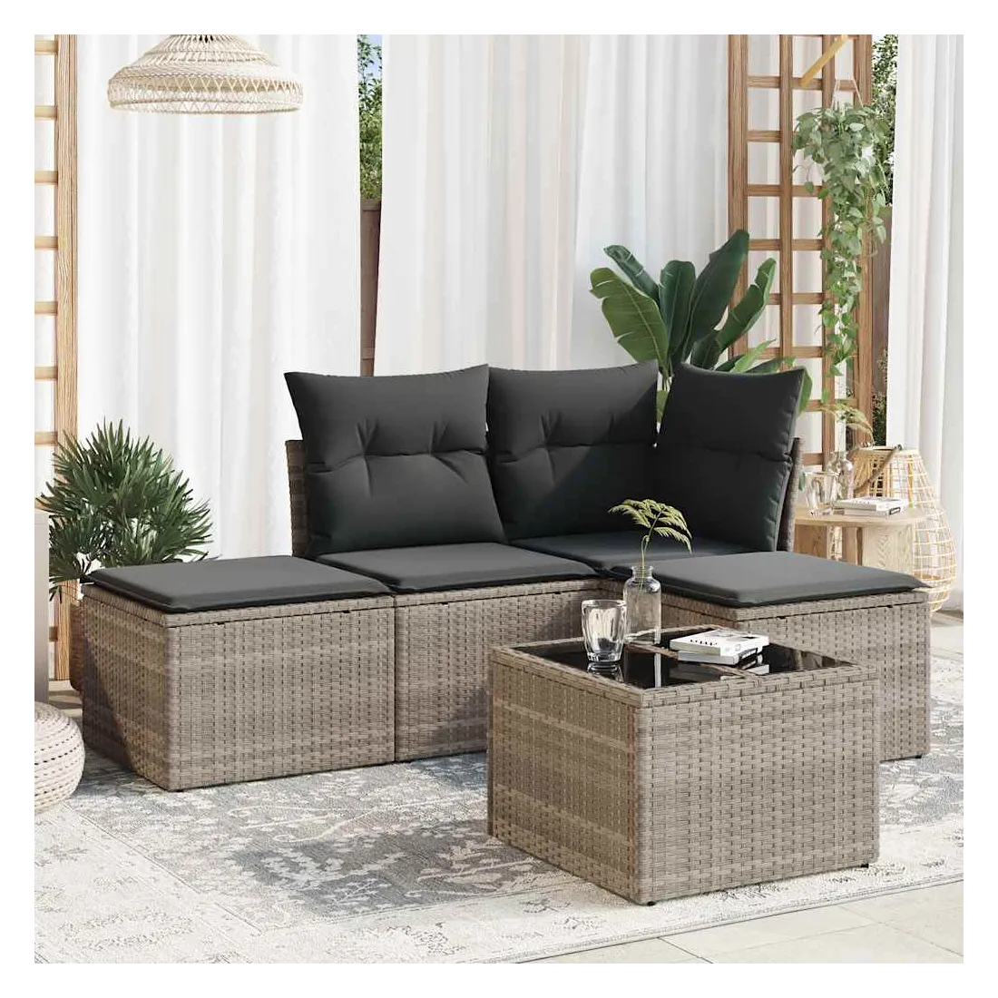 Cet ensemble de canapés de jardin est le complément parfait de votre arrière-cour, terrasse ou patio, offrant un espace confortable et accueillant pour discuter avec la famille et les amis ou simplement se détendre et profiter de l'extérieur. Matériau durable : la résine tressée, également connue sous le nom de poly rotin, est un matériau synthétique solide et nécessitant peu d'entretien qui ressemble au rotin naturel. Il est léger, facile à nettoyer et couramment utilisé pour les meubles d'extérieur en raison de sa durabilité et de ses propriétés de résistance aux intempéries.Fonction de rangement avec sac résistant à l'eau : chaque siège de jardin dispose d'un espace de rangement sous l'assise, complété par un sac résistant à l'eau pour ranger les coussins, les jouets et d'autres objets. Les sacs intérieurs sont dotés d'un couvercle et peuvent être solidement fixés aux sièges à l'aide de bandes auto-agrippantes pour plus de stabilité.Dessus en verre : le dessus de la table d'extérieur est fabriqué en verre trempé solide et durable, ce qui le rend facile à nettoyer avec un chiffon humide et ajoute une touche d'élégance à votre espace extérieur.Housse amovible et lavable : ces coussins de siège sont dotés de housses amovibles pour un lavage et un entretien faciles.Conception modulaire : cet ensemble de meubles d'extérieur a une conception modulaire, ce qui le rend complètement flexible et facile à déplacer, afin que vous puissiez créer un agencement de meubles d'extérieur personnalisé. Bon à savoir :Pour que vos meubles d'extérieur restent beaux, nous vous recommandons de les protéger avec une housse imperméable.