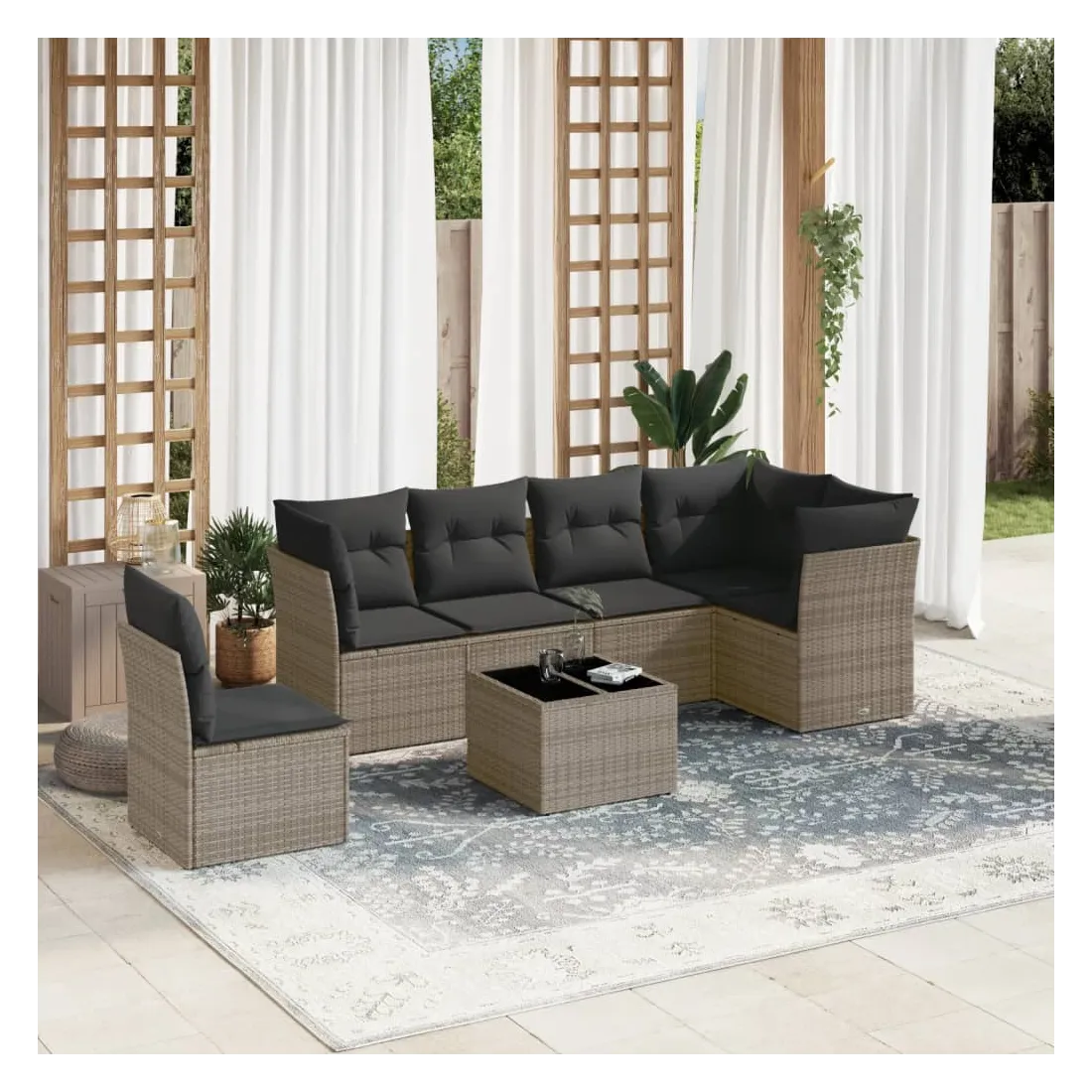 Cet ensemble de canapés de jardin est le complément parfait de votre arrière-cour, terrasse ou patio, offrant un espace confortable et accueillant pour discuter avec la famille et les amis ou simplement se détendre et profiter de l'extérieur. Matériau durable : la résine tressée, également connue sous le nom de poly rotin, est un matériau synthétique solide et nécessitant peu d'entretien qui ressemble au rotin naturel. Il est léger, facile à nettoyer et couramment utilisé pour les meubles d'extérieur en raison de sa durabilité et de ses propriétés de résistance aux intempéries.Fonction de rangement avec sac résistant à l'eau : chaque siège de jardin dispose d'un espace de rangement sous l'assise, complété par un sac résistant à l'eau pour ranger les coussins, les jouets et d'autres objets. Les sacs intérieurs sont dotés d'un couvercle et peuvent être solidement fixés aux sièges à l'aide de bandes auto-agrippantes pour plus de stabilité.Dessus en verre : le dessus de la table d'extérieur est fabriqué en verre trempé solide et durable, ce qui le rend facile à nettoyer avec un chiffon humide et ajoute une touche d'élégance à votre espace extérieur.Housse amovible et lavable : ces coussins de siège sont dotés de housses amovibles pour un lavage et un entretien faciles.Conception modulaire : cet ensemble de meubles d'extérieur a une conception modulaire, ce qui le rend complètement flexible et facile à déplacer, afin que vous puissiez créer un agencement de meubles d'extérieur personnalisé. Bon à savoir :Pour que vos meubles d'extérieur restent beaux, nous vous recommandons de les protéger avec une housse imperméable.