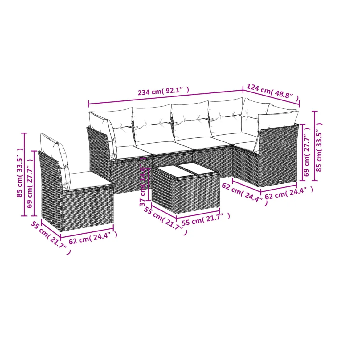 - Dimensions totales du canapé 5 places : 234 x 124 x 69 cm (l x P x H)