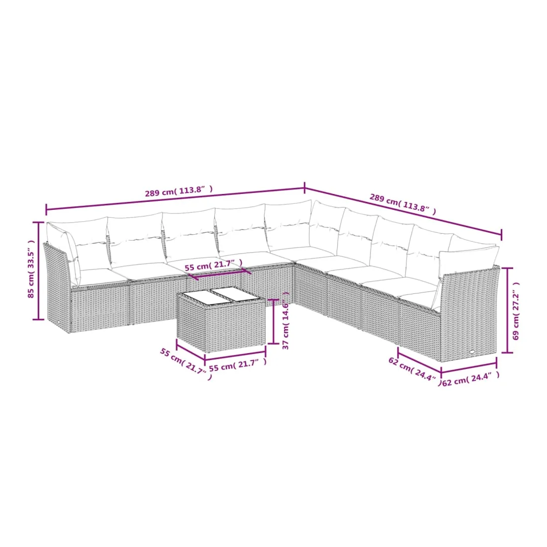 - Dimensions totales du canapé : 289 x 289 x 69 cm (l x P x H)