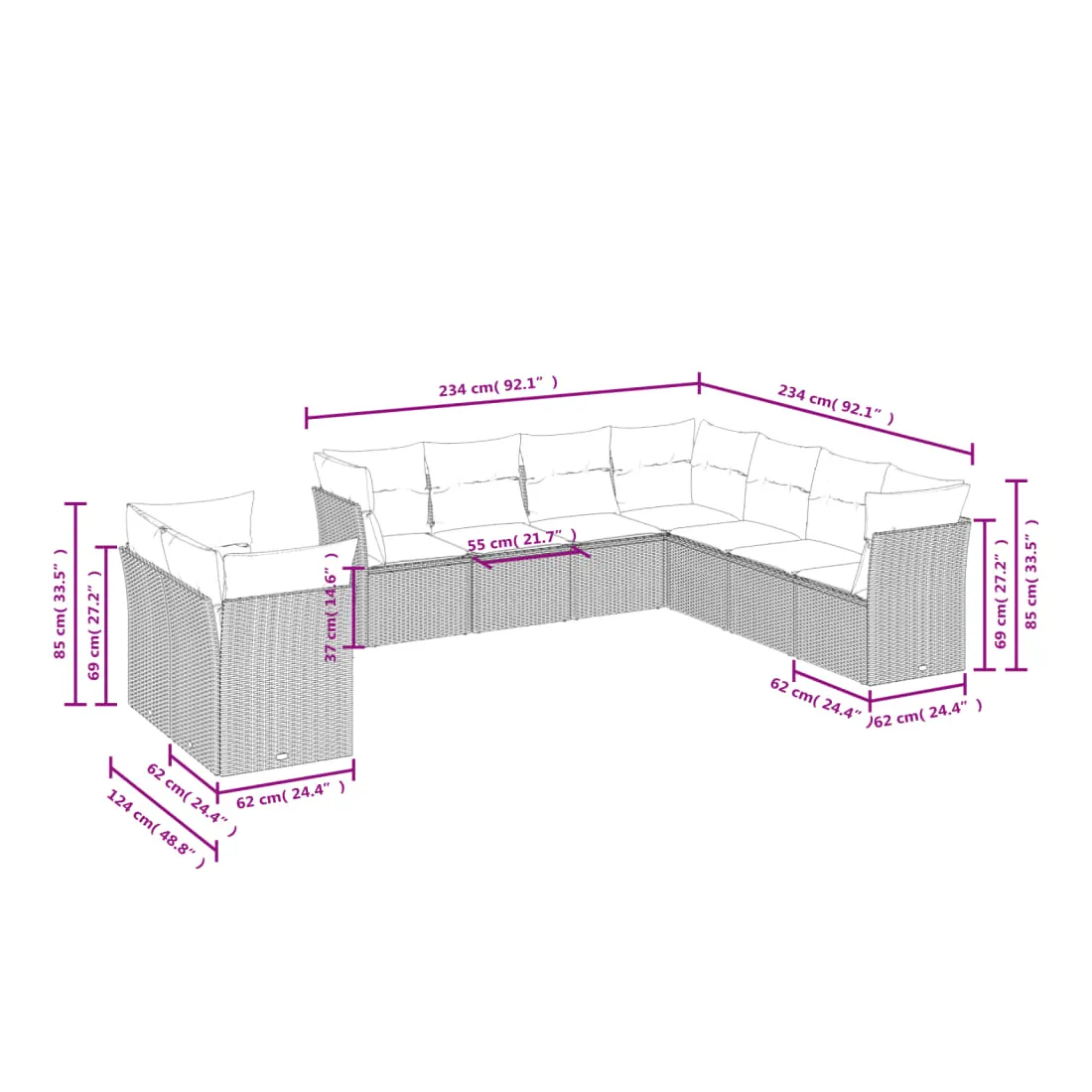 - Dimensions totales du canapé 7 places : 234 x 234 x 69 cm (l x P x H)