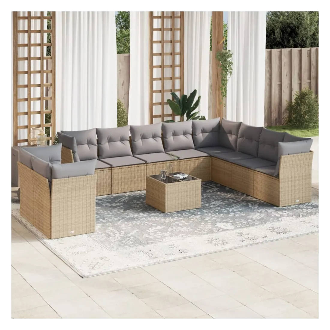 Cet ensemble de canapés de jardin est le complément parfait de votre arrière-cour, terrasse ou patio, offrant un espace confortable et accueillant pour discuter avec la famille et les amis ou simplement se détendre et profiter de l'extérieur. Matériau durable : la résine tressée, également connue sous le nom de poly rotin, est un matériau synthétique solide et nécessitant peu d'entretien qui ressemble au rotin naturel. Il est léger, facile à nettoyer et couramment utilisé pour les meubles d'extérieur en raison de sa durabilité et de ses propriétés de résistance aux intempéries.Fonction de rangement avec sac résistant à l'eau : chaque siège de jardin dispose d'un espace de rangement sous l'assise, complété par un sac résistant à l'eau pour ranger les coussins, les jouets et d'autres objets. Les sacs intérieurs sont dotés d'un couvercle et peuvent être solidement fixés aux sièges à l'aide de bandes auto-agrippantes pour plus de stabilité.Dessus en verre : le dessus de la table d'extérieur est fabriqué en verre trempé solide et durable, ce qui le rend facile à nettoyer avec un chiffon humide et ajoute une touche d'élégance à votre espace extérieur.Housse amovible et lavable : ces coussins de siège sont dotés de housses amovibles pour un lavage et un entretien faciles.Conception modulaire : cet ensemble de meubles d'extérieur a une conception modulaire, ce qui le rend complètement flexible et facile à déplacer, afin que vous puissiez créer un agencement de meubles d'extérieur personnalisé. Bon à savoir :Pour que vos meubles d'extérieur restent beaux, nous vous recommandons de les protéger avec une housse imperméable.