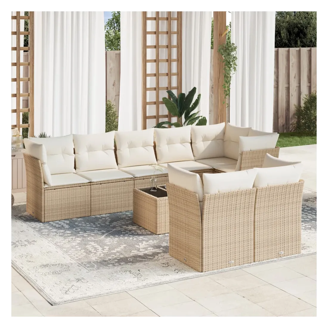 Cet ensemble de canapés de jardin est le complément parfait de votre arrière-cour, terrasse ou patio, offrant un espace confortable et accueillant pour discuter avec la famille et les amis ou simplement se détendre et profiter de l'extérieur. Matériau durable : la résine tressée, également connue sous le nom de poly rotin, est un matériau synthétique solide et nécessitant peu d'entretien qui ressemble au rotin naturel. Il est léger, facile à nettoyer et couramment utilisé pour les meubles d'extérieur en raison de sa durabilité et de ses propriétés de résistance aux intempéries.Fonction de rangement avec sac résistant à l'eau : chaque siège de jardin dispose d'un espace de rangement sous l'assise, complété par un sac résistant à l'eau pour ranger les coussins, les jouets et d'autres objets. Les sacs intérieurs sont dotés d'un couvercle et peuvent être solidement fixés aux sièges à l'aide de bandes auto-agrippantes pour plus de stabilité.Dessus en verre : le dessus de la table d'extérieur est fabriqué en verre trempé solide et durable, ce qui le rend facile à nettoyer avec un chiffon humide et ajoute une touche d'élégance à votre espace extérieur.Housse amovible et lavable : ces coussins de siège sont dotés de housses amovibles pour un lavage et un entretien faciles.Conception modulaire : cet ensemble de meubles d'extérieur a une conception modulaire, ce qui le rend complètement flexible et facile à déplacer, afin que vous puissiez créer un agencement de meubles d'extérieur personnalisé. Bon à savoir :Pour que vos meubles d'extérieur restent beaux, nous vous recommandons de les protéger avec une housse imperméable.