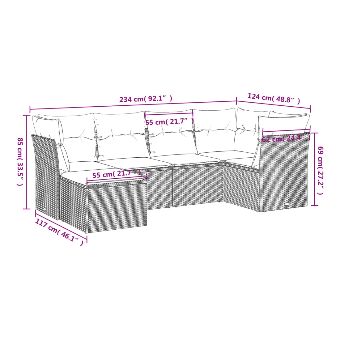 - Dimensions totales du canapé : 234 x 124 x 69 cm (l x P x H)