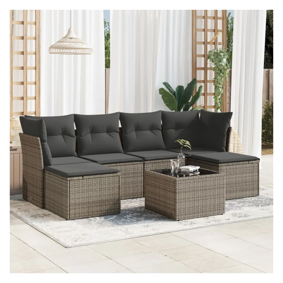 Cet ensemble de canapés de jardin est le complément parfait de votre arrière-cour, terrasse ou patio, offrant un espace confortable et accueillant pour discuter avec la famille et les amis ou simplement se détendre et profiter de l'extérieur. Matériau durable : la résine tressée, également connue sous le nom de poly rotin, est un matériau synthétique solide et nécessitant peu d'entretien qui ressemble au rotin naturel. Il est léger, facile à nettoyer et couramment utilisé pour les meubles d'extérieur en raison de sa durabilité et de ses propriétés de résistance aux intempéries.Fonction de rangement avec sac résistant à l'eau : chaque siège de jardin dispose d'un espace de rangement sous l'assise, complété par un sac résistant à l'eau pour ranger les coussins, les jouets et d'autres objets. Les sacs intérieurs sont dotés d'un couvercle et peuvent être solidement fixés aux sièges à l'aide de bandes auto-agrippantes pour plus de stabilité.Dessus en verre : le dessus de la table d'extérieur est fabriqué en verre trempé solide et durable, ce qui le rend facile à nettoyer avec un chiffon humide et ajoute une touche d'élégance à votre espace extérieur.Housse amovible et lavable : ces coussins de siège sont dotés de housses amovibles pour un lavage et un entretien faciles.Conception modulaire : cet ensemble de meubles d'extérieur a une conception modulaire, ce qui le rend complètement flexible et facile à déplacer, afin que vous puissiez créer un agencement de meubles d'extérieur personnalisé. Bon à savoir :Pour que vos meubles d'extérieur restent beaux, nous vous recommandons de les protéger avec une housse imperméable.