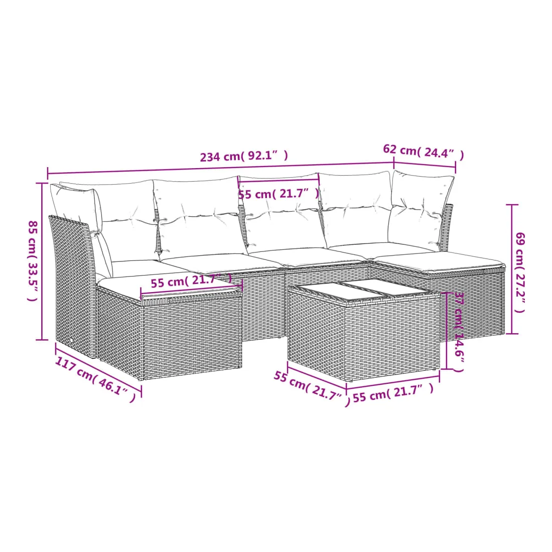 - Dimensions totales du canapé : 234 x 117 x 69 cm (l x P x H)