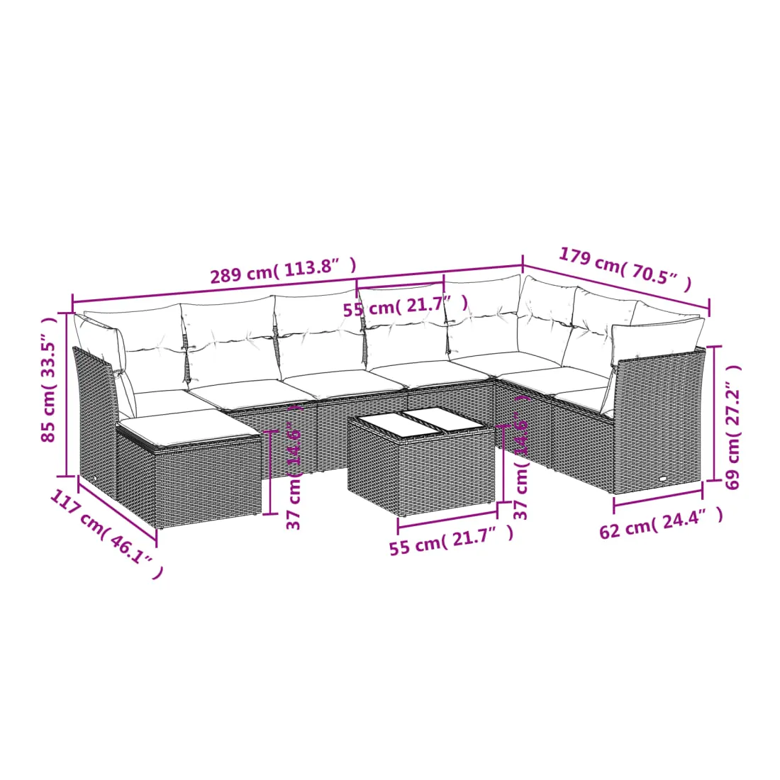- Dimensions totales du canapé : 289 x 179 x 69 cm (l x P x H)