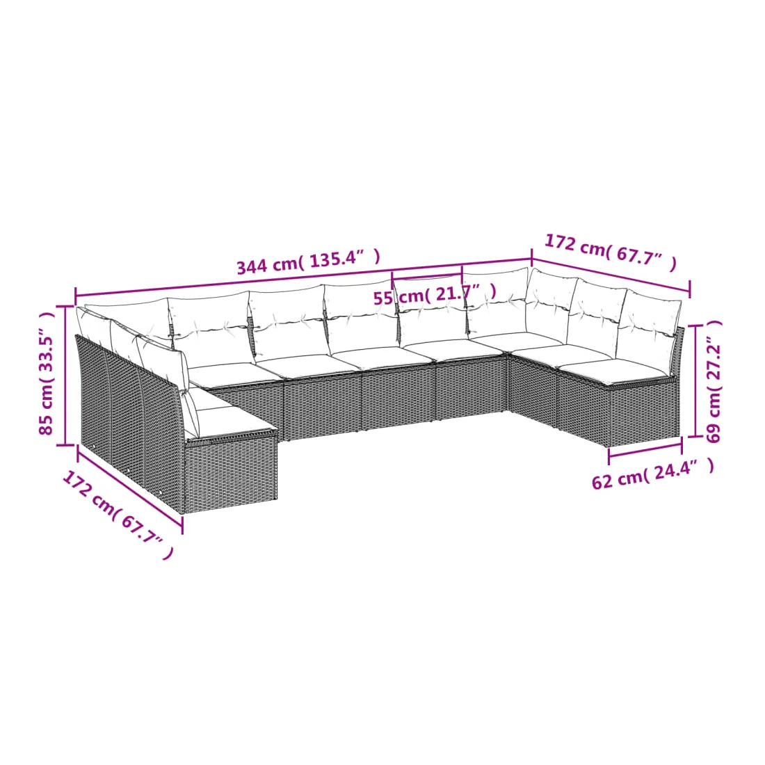 - Dimensions totales du canapé : 344 x 172 x 69 cm (l x P x H)