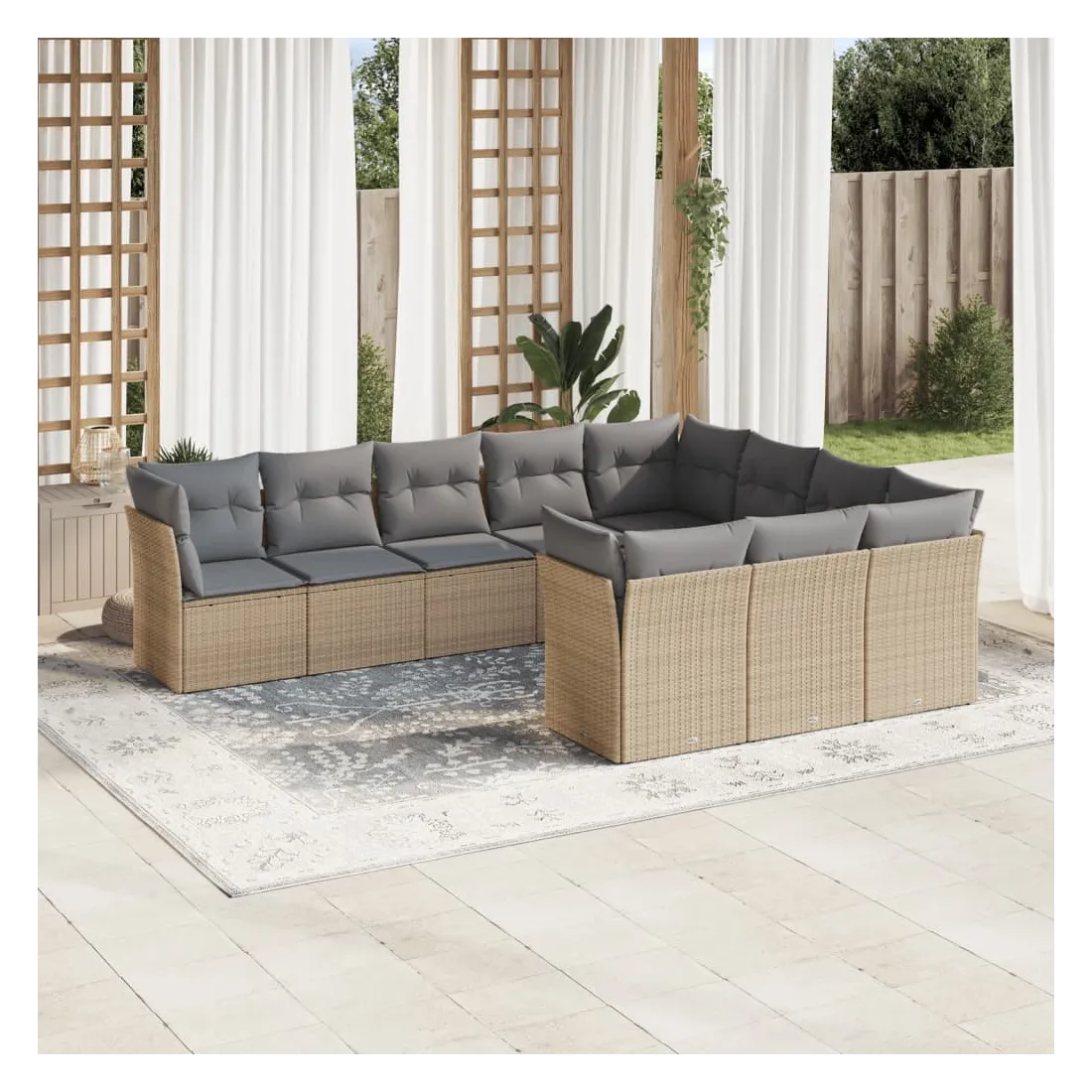 Cet ensemble de canapés de jardin est le complément parfait de votre arrière-cour, terrasse ou patio, offrant un espace confortable et accueillant pour discuter avec la famille et les amis ou simplement se détendre et profiter de l'extérieur. Matériau durable : la résine tressée, également connue sous le nom de poly rotin, est un matériau synthétique solide et nécessitant peu d'entretien qui ressemble au rotin naturel. Il est léger, facile à nettoyer et couramment utilisé pour les meubles d'extérieur en raison de sa durabilité et de ses propriétés de résistance aux intempéries.Fonction de rangement avec sac résistant à l'eau : chaque siège de jardin dispose d'un espace de rangement sous l'assise, complété par un sac résistant à l'eau pour ranger les coussins, les jouets et d'autres objets. Les sacs intérieurs sont dotés d'un couvercle et peuvent être solidement fixés aux sièges à l'aide de bandes auto-agrippantes pour plus de stabilité.Housse amovible et lavable : ces coussins de siège sont dotés de housses amovibles pour un lavage et un entretien faciles.Conception modulaire : cet ensemble de meubles d'extérieur a une conception modulaire, ce qui le rend complètement flexible et facile à déplacer, afin que vous puissiez créer un agencement de meubles d'extérieur personnalisé. Bon à savoir :Pour que vos meubles d'extérieur restent beaux, nous vous recommandons de les protéger avec une housse imperméable.