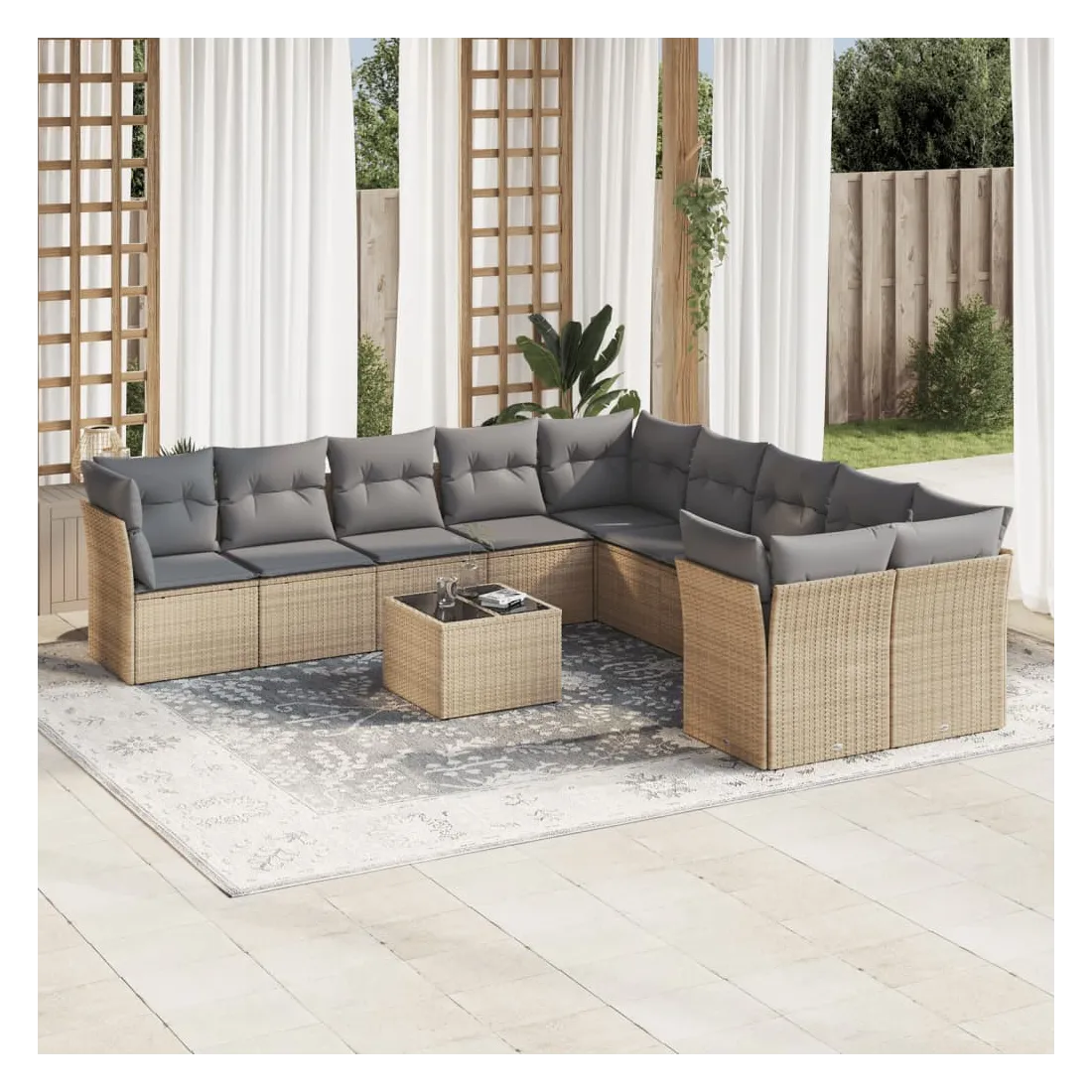 Cet ensemble de canapés de jardin est le complément parfait de votre arrière-cour, terrasse ou patio, offrant un espace confortable et accueillant pour discuter avec la famille et les amis ou simplement se détendre et profiter de l'extérieur. Matériau durable : la résine tressée, également connue sous le nom de poly rotin, est un matériau synthétique solide et nécessitant peu d'entretien qui ressemble au rotin naturel. Il est léger, facile à nettoyer et couramment utilisé pour les meubles d'extérieur en raison de sa durabilité et de ses propriétés de résistance aux intempéries.Fonction de rangement avec sac résistant à l'eau : chaque siège de jardin dispose d'un espace de rangement sous l'assise, complété par un sac résistant à l'eau pour ranger les coussins, les jouets et d'autres objets. Les sacs intérieurs sont dotés d'un couvercle et peuvent être solidement fixés aux sièges à l'aide de bandes auto-agrippantes pour plus de stabilité.Dessus en verre : le dessus de la table d'extérieur est fabriqué en verre trempé solide et durable, ce qui le rend facile à nettoyer avec un chiffon humide et ajoute une touche d'élégance à votre espace extérieur.Housse amovible et lavable : ces coussins de siège sont dotés de housses amovibles pour un lavage et un entretien faciles.Conception modulaire : cet ensemble de meubles d'extérieur a une conception modulaire, ce qui le rend complètement flexible et facile à déplacer, afin que vous puissiez créer un agencement de meubles d'extérieur personnalisé. Bon à savoir :Pour que vos meubles d'extérieur restent beaux, nous vous recommandons de les protéger avec une housse imperméable.