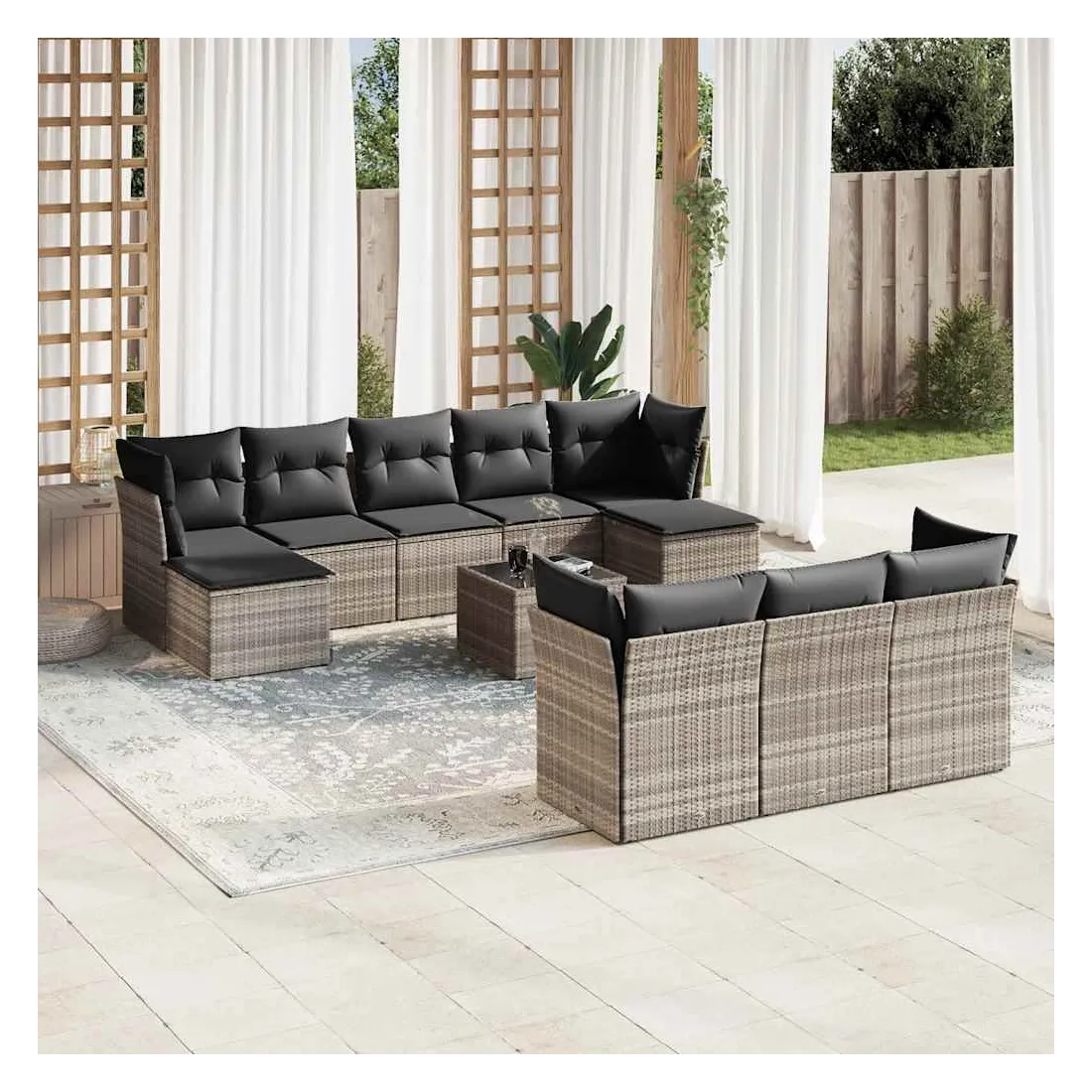 Cet ensemble de canapés de jardin est le complément parfait de votre arrière-cour, terrasse ou patio, offrant un espace confortable et accueillant pour discuter avec la famille et les amis ou simplement se détendre et profiter de l'extérieur. Matériau durable : la résine tressée, également connue sous le nom de poly rotin, est un matériau synthétique solide et nécessitant peu d'entretien qui ressemble au rotin naturel. Il est léger, facile à nettoyer et couramment utilisé pour les meubles d'extérieur en raison de sa durabilité et de ses propriétés de résistance aux intempéries.Fonction de rangement avec sac résistant à l'eau : chaque siège de jardin dispose d'un espace de rangement sous l'assise, complété par un sac résistant à l'eau pour ranger les coussins, les jouets et d'autres objets. Les sacs intérieurs sont dotés d'un couvercle et peuvent être solidement fixés aux sièges à l'aide de bandes auto-agrippantes pour plus de stabilité.Dessus en verre : le dessus de la table d'extérieur est fabriqué en verre trempé solide et durable, ce qui le rend facile à nettoyer avec un chiffon humide et ajoute une touche d'élégance à votre espace extérieur.Housse amovible et lavable : ces coussins de siège sont dotés de housses amovibles pour un lavage et un entretien faciles.Conception modulaire : cet ensemble de meubles d'extérieur a une conception modulaire, ce qui le rend complètement flexible et facile à déplacer, afin que vous puissiez créer un agencement de meubles d'extérieur personnalisé. Bon à savoir :Pour que vos meubles d'extérieur restent beaux, nous vous recommandons de les protéger avec une housse imperméable.