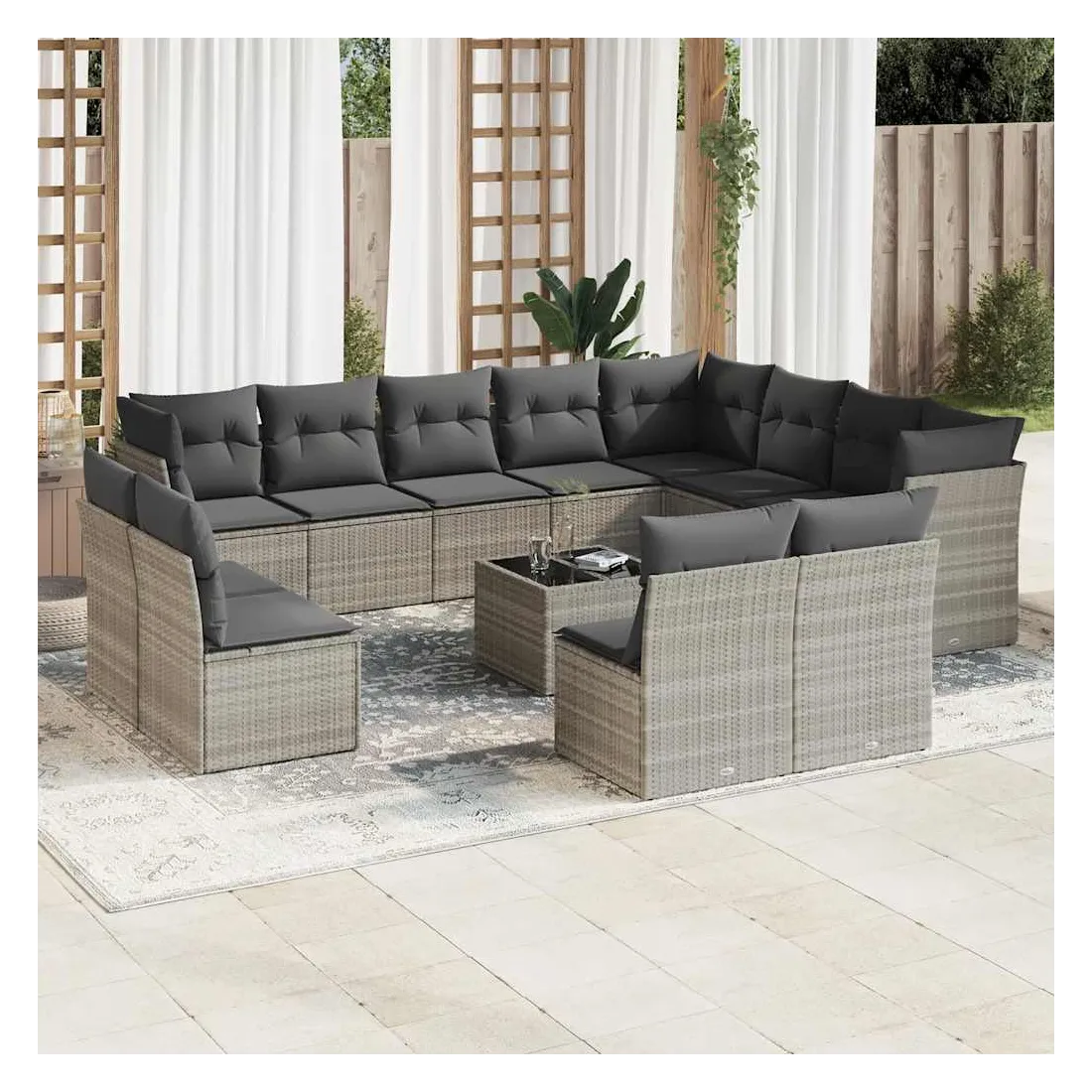 Cet ensemble de canapés de jardin est le complément parfait de votre arrière-cour, terrasse ou patio, offrant un espace confortable et accueillant pour discuter avec la famille et les amis ou simplement se détendre et profiter de l'extérieur. Matériau durable : la résine tressée, également connue sous le nom de poly rotin, est un matériau synthétique solide et nécessitant peu d'entretien qui ressemble au rotin naturel. Il est léger, facile à nettoyer et couramment utilisé pour les meubles d'extérieur en raison de sa durabilité et de ses propriétés de résistance aux intempéries.Fonction de rangement avec sac résistant à l'eau : chaque siège de jardin dispose d'un espace de rangement sous l'assise, complété par un sac résistant à l'eau pour ranger les coussins, les jouets et d'autres objets. Les sacs intérieurs sont dotés d'un couvercle et peuvent être solidement fixés aux sièges à l'aide de bandes auto-agrippantes pour plus de stabilité.Dessus en verre : le dessus de la table d'extérieur est fabriqué en verre trempé solide et durable, ce qui le rend facile à nettoyer avec un chiffon humide et ajoute une touche d'élégance à votre espace extérieur.Housse amovible et lavable : ces coussins de siège sont dotés de housses amovibles pour un lavage et un entretien faciles.Conception modulaire : cet ensemble de meubles d'extérieur a une conception modulaire, ce qui le rend complètement flexible et facile à déplacer, afin que vous puissiez créer un agencement de meubles d'extérieur personnalisé. Bon à savoir :Pour que vos meubles d'extérieur restent beaux, nous vous recommandons de les protéger avec une housse imperméable.