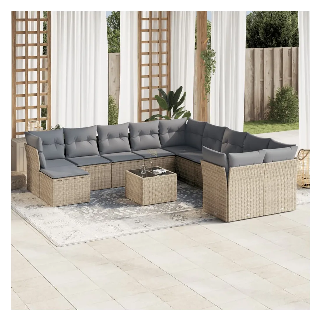 Cet ensemble de canapés de jardin est le complément parfait de votre arrière-cour, terrasse ou patio, offrant un espace confortable et accueillant pour discuter avec la famille et les amis ou simplement se détendre et profiter de l'extérieur. Matériau durable : la résine tressée, également connue sous le nom de poly rotin, est un matériau synthétique solide et nécessitant peu d'entretien qui ressemble au rotin naturel. Il est léger, facile à nettoyer et couramment utilisé pour les meubles d'extérieur en raison de sa durabilité et de ses propriétés de résistance aux intempéries.Fonction de rangement avec sac résistant à l'eau : chaque siège de jardin dispose d'un espace de rangement sous l'assise, complété par un sac résistant à l'eau pour ranger les coussins, les jouets et d'autres objets. Les sacs intérieurs sont dotés d'un couvercle et peuvent être solidement fixés aux sièges à l'aide de bandes auto-agrippantes pour plus de stabilité.Dessus en verre : le dessus de la table d'extérieur est fabriqué en verre trempé solide et durable, ce qui le rend facile à nettoyer avec un chiffon humide et ajoute une touche d'élégance à votre espace extérieur.Housse amovible et lavable : ces coussins de siège sont dotés de housses amovibles pour un lavage et un entretien faciles.Conception modulaire : cet ensemble de meubles d'extérieur a une conception modulaire, ce qui le rend complètement flexible et facile à déplacer, afin que vous puissiez créer un agencement de meubles d'extérieur personnalisé. Bon à savoir :Pour que vos meubles d'extérieur restent beaux, nous vous recommandons de les protéger avec une housse imperméable.