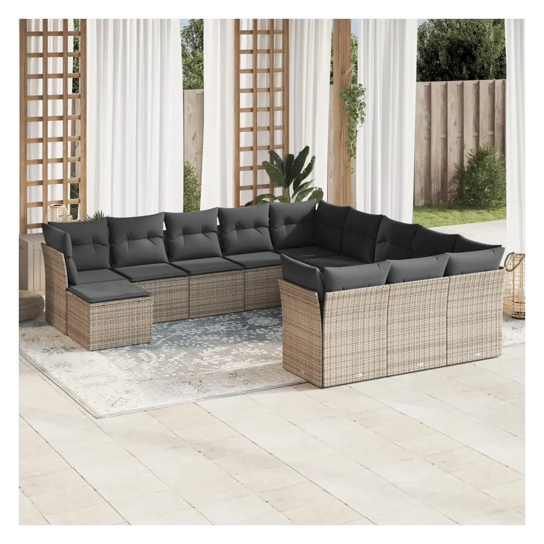 Cet ensemble de canapés de jardin est le complément parfait de votre arrière-cour, terrasse ou patio, offrant un espace confortable et accueillant pour discuter avec la famille et les amis ou simplement se détendre et profiter de l'extérieur. Matériau durable : la résine tressée, également connue sous le nom de poly rotin, est un matériau synthétique solide et nécessitant peu d'entretien qui ressemble au rotin naturel. Il est léger, facile à nettoyer et couramment utilisé pour les meubles d'extérieur en raison de sa durabilité et de ses propriétés de résistance aux intempéries.Fonction de rangement avec sac résistant à l'eau : chaque siège de jardin dispose d'un espace de rangement sous l'assise, complété par un sac résistant à l'eau pour ranger les coussins, les jouets et d'autres objets. Les sacs intérieurs sont dotés d'un couvercle et peuvent être solidement fixés aux sièges à l'aide de bandes auto-agrippantes pour plus de stabilité.Housse amovible et lavable : ces coussins de siège sont dotés de housses amovibles pour un lavage et un entretien faciles.Conception modulaire : cet ensemble de meubles d'extérieur a une conception modulaire, ce qui le rend complètement flexible et facile à déplacer, afin que vous puissiez créer un agencement de meubles d'extérieur personnalisé. Bon à savoir :Pour que vos meubles d'extérieur restent beaux, nous vous recommandons de les protéger avec une housse imperméable.