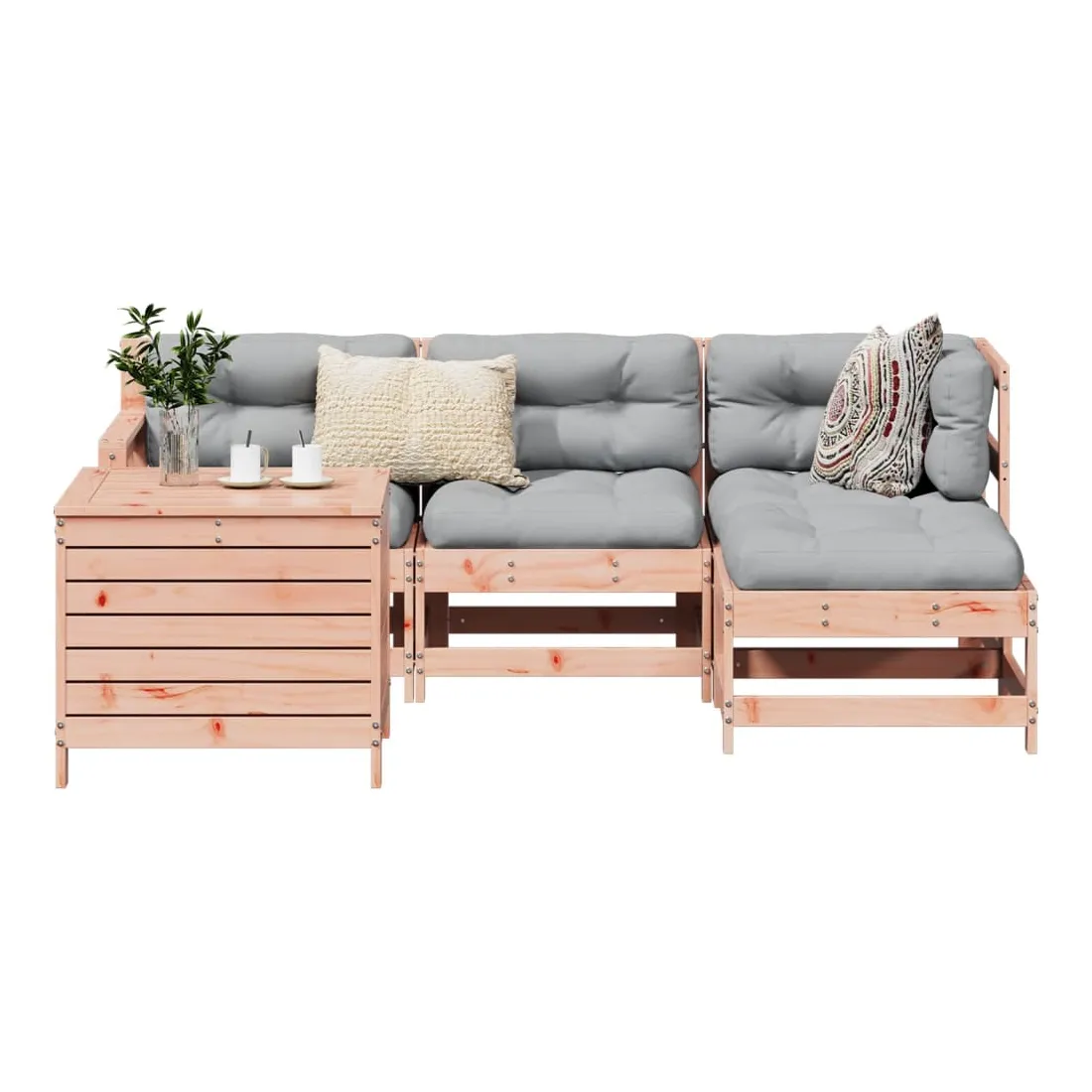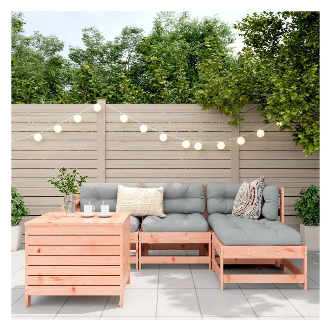 Cet ensemble de salon de jardin en bois avec un design à lattes sera un excellent complément à votre jardin, patio ou terrasse pour profiter d'un moment agréable avec votre famille ou vos amis. Matériau robuste et durable : le bois de sapin de douglas est connu pour sa résistance et sa durabilité. Sa couleur brun rougeâtre riche et ses grains uniques dégagent une ambiance chaleureuse et naturelle. Sa stabilité et sa résistance aux intempéries sont idéales pour la fabrication de meubles d'intérieur et d'extérieur. Bien ventilé et prévention de l'accumulation d'eau : la conception à lattes favorise une circulation optimale de l'air et empêche efficacement l'accumulation d'eau, assurant ainsi une assise sèche et confortable. Utilisation polyvalente : le repose-pied de jardin peut non seulement être utilisé pour s'asseoir ou se détendre, mais il peut également être utilisé comme table basse pour contenir vos boissons, votre nourriture et d'autres décorations. Table pratique : la table de jardin vous offre un endroit pratique pour atteindre facilement vos essentiels. Conception modulaire : cet ensemble de meubles d'extérieur a une conception modulaire, ce qui le rend complètement flexible et facile à déplacer, afin que vous puissiez créer un agencement de meubles d'extérieur personnalisé. Bon à savoir :Pour que vos meubles d'extérieur restent beaux, nous vous recommandons de les protéger avec une housse imperméable.
