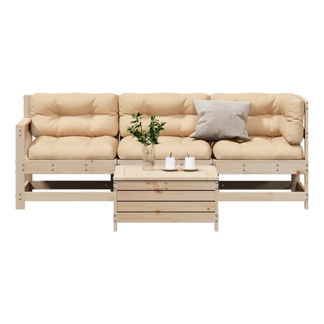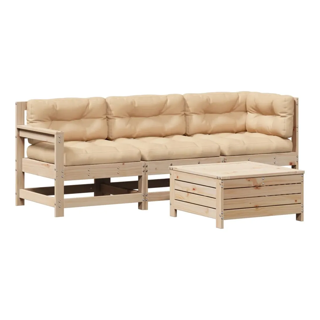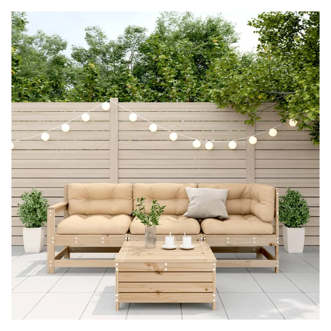Cet ensemble de salon de jardin en bois avec un design à lattes sera un excellent complément à votre jardin, patio ou terrasse pour profiter d'un moment agréable avec votre famille ou vos amis. Bois de pin massif : le bois de pin massif est un matériau naturel magnifique. Le bois de pin a un grain droit et les nœuds donnent au matériau son aspect caractéristique et rustique.Design à lattes : le design à lattes de la chaise de jardin en bois empêche l'accumulation de l'eau, ce qui permet de garder le siège au sec et d'éviter un pourrissement inutile.Expérience d'assise confortable : le dossier et l'accoudoir ajoutent un confort d'assise supplémentaire à l'ensemble de meubles de jardin. De plus, le coussin bien rembourré vous permet de vous asseoir confortablement.Utilisation polyvalente : le pouf d'extérieur avec couvercle peut non seulement être utilisé pour s'asseoir ou se détendre, mais il peut également être utilisé comme table basse pour contenir vos boissons, votre nourriture et le meuble de jardin dispose d'un espace de rangement sous le siège. Conception modulaire : cet ensemble de meubles d'extérieur a une conception modulaire, ce qui le rend complètement flexible et facile à déplacer, afin que vous puissiez créer un agencement de meubles d'extérieur personnalisé. Bon à savoir :Pour que vos meubles d'extérieur restent beaux, nous vous recommandons de les protéger avec une housse imperméable.