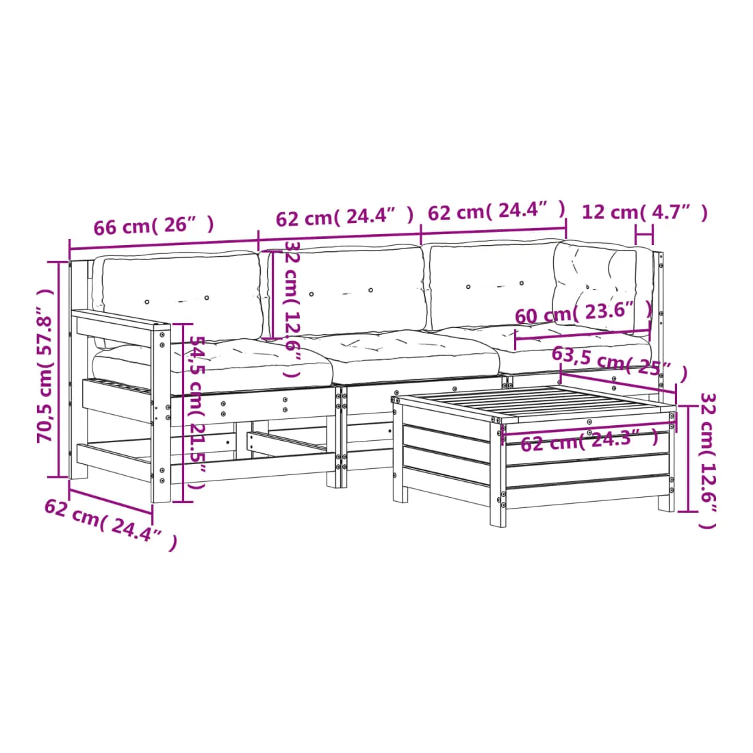 - Dimensions du repose-pied de jardin : 62 x 63,5 x 32 cm (l x P x H)
