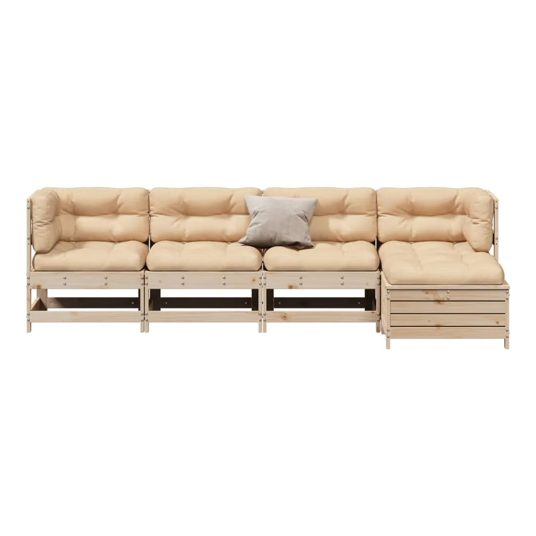 Cet ensemble de salon de jardin en bois avec un design à lattes sera un excellent complément à votre jardin, patio ou terrasse pour profiter d'un moment agréable avec votre famille ou vos amis. Bois de pin massif : le bois de pin massif est un matériau naturel magnifique. Le bois de pin a un grain droit et les nœuds donnent au matériau son aspect caractéristique et rustique.Design à lattes : le design à lattes de la chaise de jardin en bois empêche l'accumulation de l'eau, ce qui permet de garder le siège au sec et d'éviter un pourrissement inutile.Expérience d'assise confortable : le dossier et l'accoudoir ajoutent un confort d'assise supplémentaire à l'ensemble de meubles de jardin. De plus, le coussin bien rembourré vous permet de vous asseoir confortablement.Utilisation polyvalente : le pouf d'extérieur avec couvercle peut non seulement être utilisé pour s'asseoir ou se détendre, mais il peut également être utilisé comme table basse pour contenir vos boissons, votre nourriture et le meuble de jardin dispose d'un espace de rangement sous le siège. Conception modulaire : cet ensemble de meubles d'extérieur a une conception modulaire, ce qui le rend complètement flexible et facile à déplacer, afin que vous puissiez créer un agencement de meubles d'extérieur personnalisé. Bon à savoir :Pour que vos meubles d'extérieur restent beaux, nous vous recommandons de les protéger avec une housse imperméable.