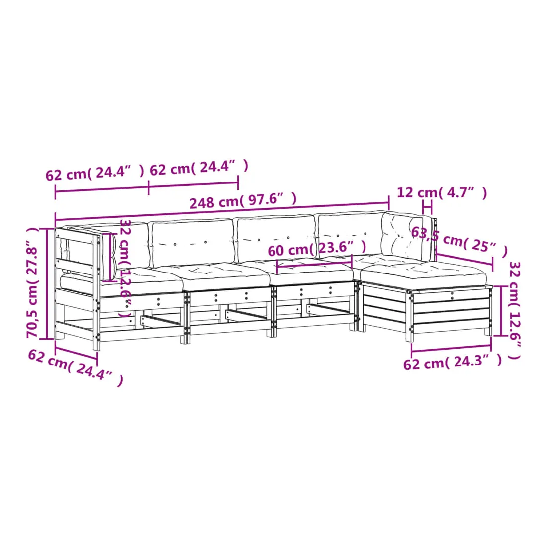 - Dimensions du canapé d'angle de jardin : 62 x 62 x 70,5 cm (l x P x H)