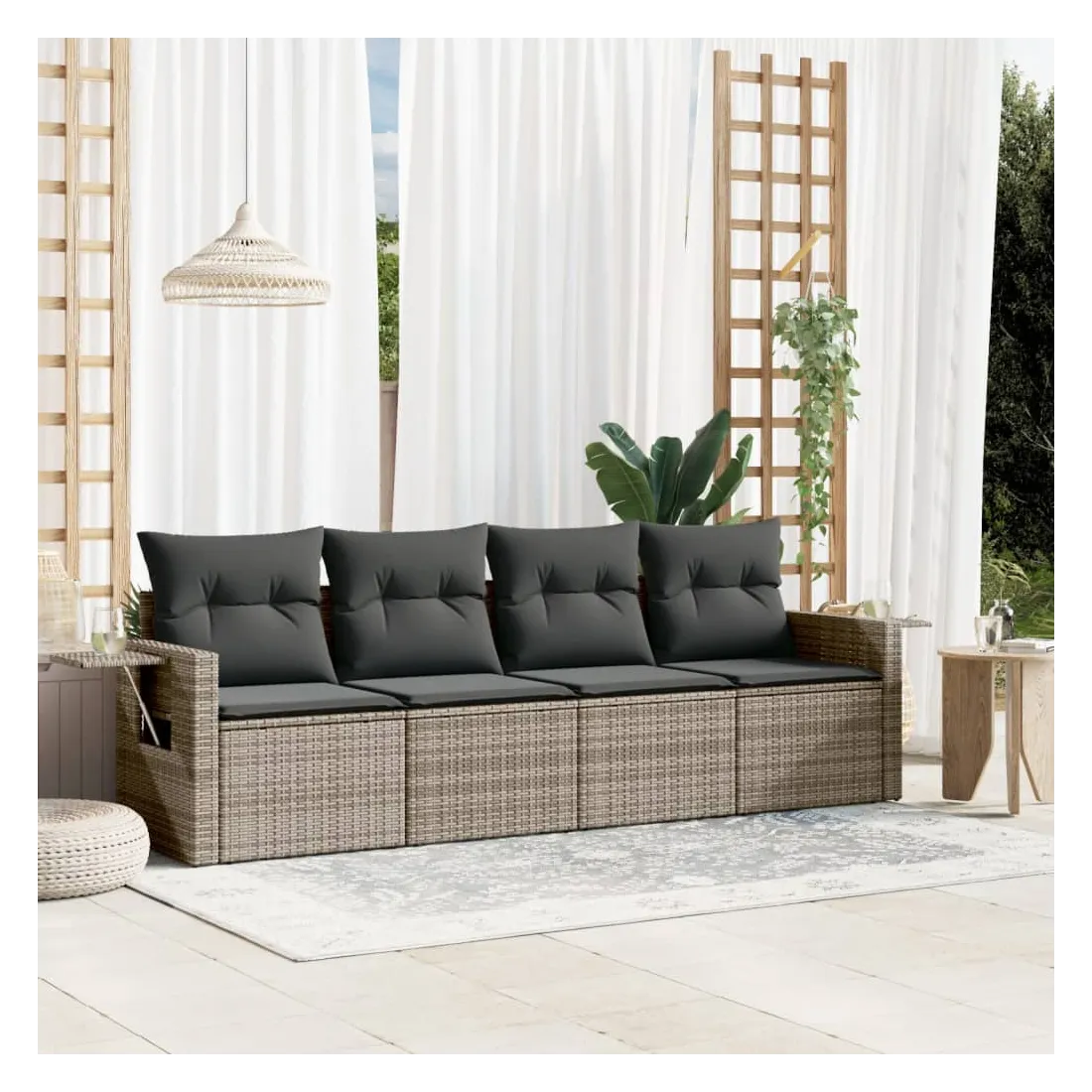 Cet ensemble de canapés de jardin est le complément parfait de votre arrière-cour, terrasse ou patio, offrant un espace confortable et accueillant pour discuter avec la famille et les amis ou simplement se détendre et profiter de l'extérieur. Matériau durable : la résine tressée, également connue sous le nom de poly rotin, est un matériau synthétique solide et nécessitant peu d'entretien qui ressemble au rotin naturel. Il est léger, facile à nettoyer et couramment utilisé pour les meubles d'extérieur en raison de sa durabilité et de ses propriétés de résistance aux intempéries.Fonction de rangement avec sac résistant à l'eau : le mobilier de jardin dispose d'un espace de rangement sous l'assise, complété par un sac résistant à l'eau pour ranger coussins, jouets et autres objets. Le sac intérieur peut être solidement fixé au mobilier d'extérieur grâce à des attaches auto-agrippantes pour plus de stabilité.Table d'appoint pratique : ce mobilier d'extérieur comprend une table d'appoint pliable avec un ressort à gaz sur les accoudoirs, offrant un endroit pratique pour garder vos essentiels à portée de main.Housse amovible et lavable : ces coussins de siège sont dotés de housses amovibles pour un lavage et un entretien faciles.Conception modulaire : cet ensemble de meubles d'extérieur a une conception modulaire, ce qui le rend complètement flexible et facile à déplacer, afin que vous puissiez créer un agencement de meubles d'extérieur personnalisé. Bon à savoir :Pour que vos meubles d'extérieur restent beaux, nous vous recommandons de les protéger avec une housse imperméable.