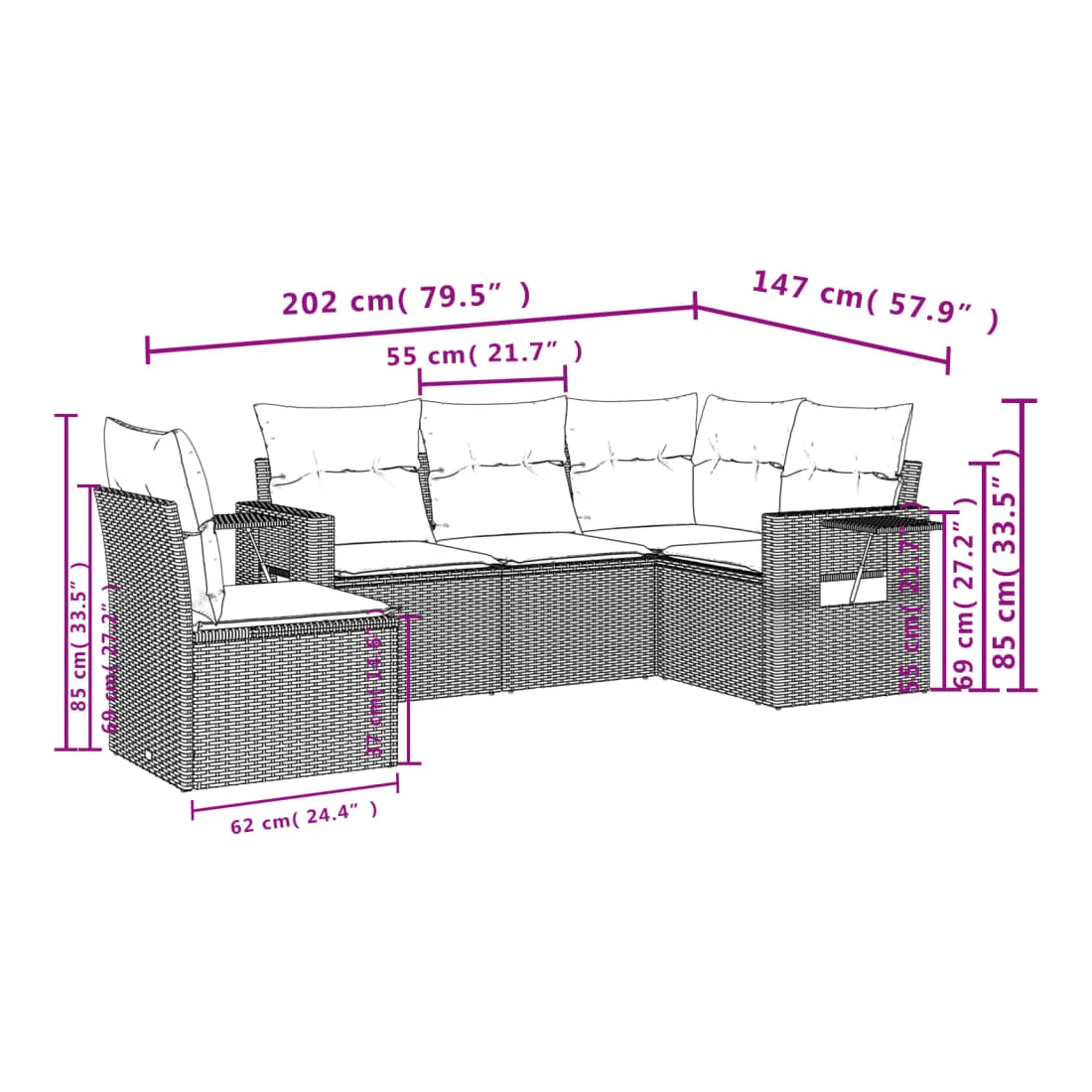 Cet ensemble de canapés de jardin est le complément parfait de votre arrière-cour, terrasse ou patio, offrant un espace confortable et accueillant pour discuter avec la famille et les amis ou simplement se détendre et profiter de l'extérieur. Matériau durable : la résine tressée, également connue sous le nom de poly rotin, est un matériau synthétique solide et nécessitant peu d'entretien qui ressemble au rotin naturel. Il est léger, facile à nettoyer et couramment utilisé pour les meubles d'extérieur en raison de sa durabilité et de ses propriétés de résistance aux intempéries.Fonction de rangement avec sac résistant à l'eau : le mobilier de jardin dispose d'un espace de rangement sous l'assise, complété par un sac résistant à l'eau pour ranger coussins, jouets et autres objets. Le sac intérieur peut être solidement fixé au mobilier d'extérieur grâce à des attaches auto-agrippantes pour plus de stabilité.Table d'appoint pratique : ce mobilier d'extérieur comprend une table d'appoint pliable avec un ressort à gaz sur les accoudoirs, offrant un endroit pratique pour garder vos essentiels à portée de main.Housse amovible et lavable : ces coussins de siège sont dotés de housses amovibles pour un lavage et un entretien faciles.Conception modulaire : cet ensemble de meubles d'extérieur a une conception modulaire, ce qui le rend complètement flexible et facile à déplacer, afin que vous puissiez créer un agencement de meubles d'extérieur personnalisé. Bon à savoir :Pour que vos meubles d'extérieur restent beaux, nous vous recommandons de les protéger avec une housse imperméable.