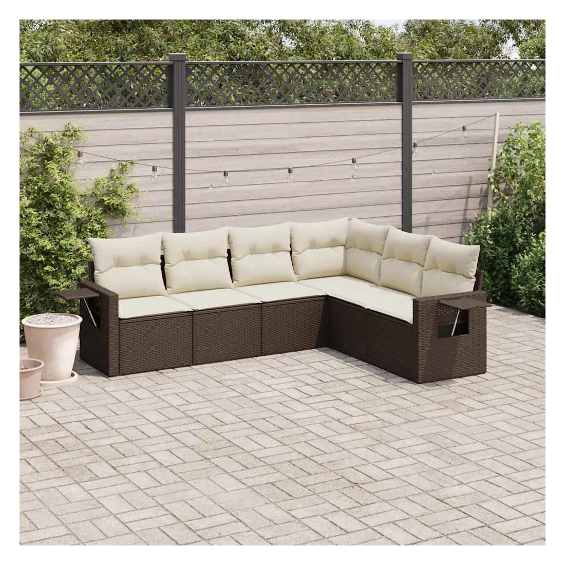 Cet ensemble de canapés de jardin est le complément parfait de votre arrière-cour, terrasse ou patio, offrant un espace confortable et accueillant pour discuter avec la famille et les amis ou simplement se détendre et profiter de l'extérieur. Matériau durable : la résine tressée, également connue sous le nom de poly rotin, est un matériau synthétique solide et nécessitant peu d'entretien qui ressemble au rotin naturel. Il est léger, facile à nettoyer et couramment utilisé pour les meubles d'extérieur en raison de sa durabilité et de ses propriétés de résistance aux intempéries.Fonction de rangement avec sac résistant à l'eau : le mobilier de jardin dispose d'un espace de rangement sous l'assise, complété par un sac résistant à l'eau pour ranger coussins, jouets et autres objets. Le sac intérieur peut être solidement fixé au mobilier d'extérieur grâce à des attaches auto-agrippantes pour plus de stabilité.Table d'appoint pratique : ce mobilier d'extérieur comprend une table d'appoint pliable avec un ressort à gaz sur les accoudoirs, offrant un endroit pratique pour garder vos essentiels à portée de main.Housse amovible et lavable : ces coussins de siège sont dotés de housses amovibles pour un lavage et un entretien faciles.Conception modulaire : cet ensemble de meubles d'extérieur a une conception modulaire, ce qui le rend complètement flexible et facile à déplacer, afin que vous puissiez créer un agencement de meubles d'extérieur personnalisé. Bon à savoir :Pour que vos meubles d'extérieur restent beaux, nous vous recommandons de les protéger avec une housse imperméable.