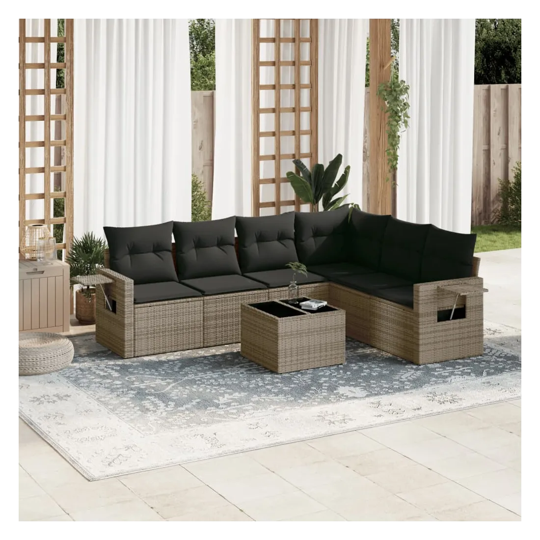 Cet ensemble de canapés de jardin est le complément parfait de votre arrière-cour, terrasse ou patio, offrant un espace confortable et accueillant pour discuter avec la famille et les amis ou simplement se détendre et profiter de l'extérieur. Matériau durable : la résine tressée, également connue sous le nom de poly rotin, est un matériau synthétique solide et nécessitant peu d'entretien qui ressemble au rotin naturel. Il est léger, facile à nettoyer et couramment utilisé pour les meubles d'extérieur en raison de sa durabilité et de ses propriétés de résistance aux intempéries.Fonction de rangement avec sac résistant à l'eau : le mobilier de jardin dispose d'un espace de rangement sous l'assise, complété par un sac résistant à l'eau pour ranger coussins, jouets et autres objets. Le sac intérieur peut être solidement fixé au mobilier d'extérieur grâce à des attaches auto-agrippantes pour plus de stabilité.Table d'appoint pratique : ce mobilier d'extérieur comprend une table d'appoint pliable avec un ressort à gaz sur les accoudoirs, offrant un endroit pratique pour garder vos essentiels à portée de main.Housse amovible et lavable : ces coussins de siège sont dotés de housses amovibles pour un lavage et un entretien faciles.Conception modulaire : cet ensemble de meubles d'extérieur a une conception modulaire, ce qui le rend complètement flexible et facile à déplacer, afin que vous puissiez créer un agencement de meubles d'extérieur personnalisé. Bon à savoir :Pour que vos meubles d'extérieur restent beaux, nous vous recommandons de les protéger avec une housse imperméable.