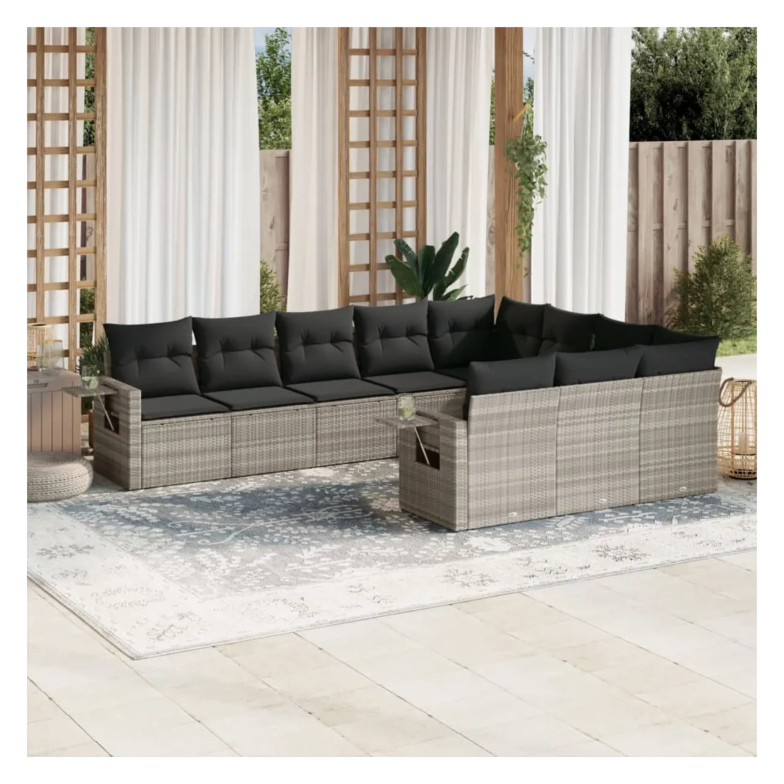 Cet ensemble de canapés de jardin est le complément parfait de votre arrière-cour, terrasse ou patio, offrant un espace confortable et accueillant pour discuter avec la famille et les amis ou simplement se détendre et profiter de l'extérieur. Matériau durable : la résine tressée, également connue sous le nom de poly rotin, est un matériau synthétique solide et nécessitant peu d'entretien qui ressemble au rotin naturel. Il est léger, facile à nettoyer et couramment utilisé pour les meubles d'extérieur en raison de sa durabilité et de ses propriétés de résistance aux intempéries.Fonction de rangement avec sac résistant à l'eau : le mobilier de jardin dispose d'un espace de rangement sous l'assise, complété par un sac résistant à l'eau pour ranger coussins, jouets et autres objets. Le sac intérieur peut être solidement fixé au mobilier d'extérieur grâce à des attaches auto-agrippantes pour plus de stabilité.Table d'appoint pratique : ce mobilier d'extérieur comprend une table d'appoint pliable avec un ressort à gaz sur les accoudoirs, offrant un endroit pratique pour garder vos essentiels à portée de main.Housse amovible et lavable : ces coussins de siège sont dotés de housses amovibles pour un lavage et un entretien faciles.Conception modulaire : cet ensemble de meubles d'extérieur a une conception modulaire, ce qui le rend complètement flexible et facile à déplacer, afin que vous puissiez créer un agencement de meubles d'extérieur personnalisé. Bon à savoir :Pour que vos meubles d'extérieur restent beaux, nous vous recommandons de les protéger avec une housse imperméable.