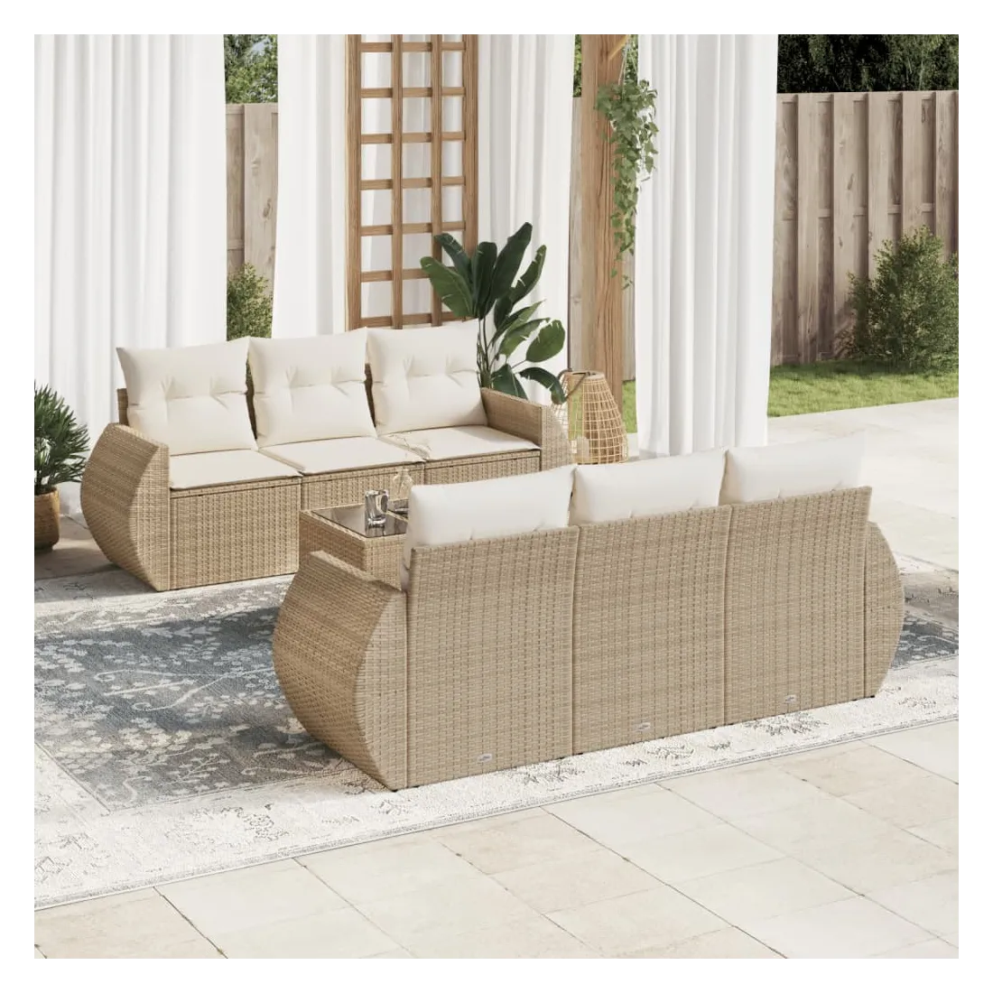Cet ensemble de canapés de jardin est le complément parfait de votre arrière-cour, terrasse ou patio, offrant un espace confortable et accueillant pour discuter avec la famille et les amis ou simplement se détendre et profiter de l'extérieur. Matériau durable : la résine tressée, également connue sous le nom de poly rotin, est un matériau synthétique solide et nécessitant peu d'entretien qui ressemble au rotin naturel. Il est léger, facile à nettoyer et couramment utilisé pour les meubles d'extérieur en raison de sa durabilité et de ses propriétés de résistance aux intempéries.Fonction de rangement avec sac résistant à l'eau : chaque siège de jardin dispose d'un espace de rangement sous l'assise, complété par un sac résistant à l'eau pour ranger les coussins, les jouets et d'autres objets. Les sacs intérieurs sont dotés d'un couvercle et peuvent être solidement fixés aux sièges à l'aide de bandes auto-agrippantes pour plus de stabilité.Dessus en verre : le dessus de la table d'extérieur est fabriqué en verre trempé solide et durable, ce qui le rend facile à nettoyer avec un chiffon humide et ajoute une touche d'élégance à votre espace extérieur.Housse amovible et lavable : ces coussins de siège sont dotés de housses amovibles pour un lavage et un entretien faciles.Conception modulaire : cet ensemble de meubles d'extérieur a une conception modulaire, ce qui le rend complètement flexible et facile à déplacer, afin que vous puissiez créer un agencement de meubles d'extérieur personnalisé. Bon à savoir :Pour que vos meubles d'extérieur restent beaux, nous vous recommandons de les protéger avec une housse imperméable.