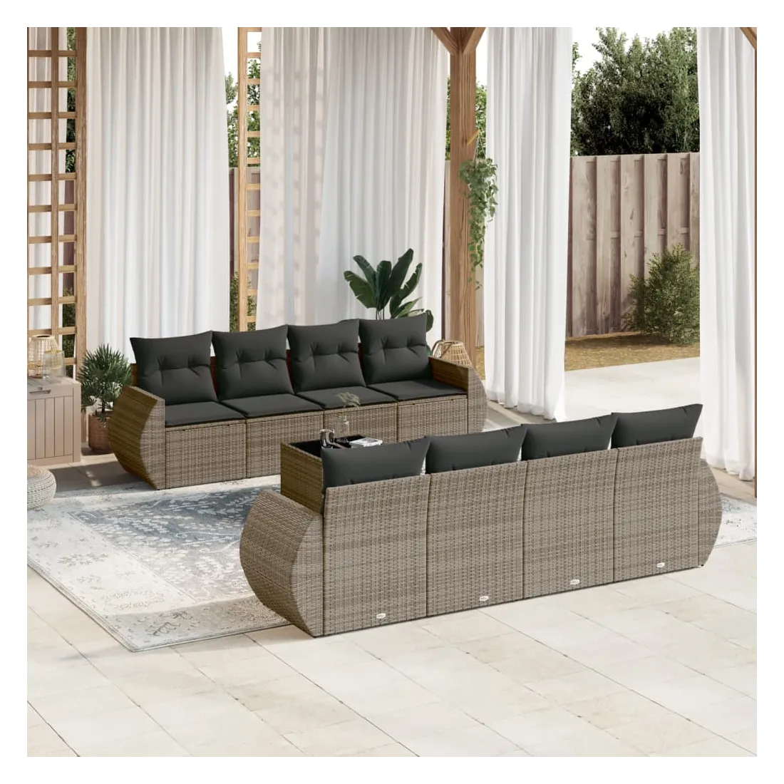 Cet ensemble de canapés de jardin est le complément parfait de votre arrière-cour, terrasse ou patio, offrant un espace confortable et accueillant pour discuter avec la famille et les amis ou simplement se détendre et profiter de l'extérieur. Matériau durable : la résine tressée, également connue sous le nom de poly rotin, est un matériau synthétique solide et nécessitant peu d'entretien qui ressemble au rotin naturel. Il est léger, facile à nettoyer et couramment utilisé pour les meubles d'extérieur en raison de sa durabilité et de ses propriétés de résistance aux intempéries.Fonction de rangement avec sac résistant à l'eau : chaque siège de jardin dispose d'un espace de rangement sous l'assise, complété par un sac résistant à l'eau pour ranger les coussins, les jouets et d'autres objets. Les sacs intérieurs sont dotés d'un couvercle et peuvent être solidement fixés aux sièges à l'aide de bandes auto-agrippantes pour plus de stabilité.Dessus en verre : le dessus de la table d'extérieur est fabriqué en verre trempé solide et durable, ce qui le rend facile à nettoyer avec un chiffon humide et ajoute une touche d'élégance à votre espace extérieur.Housse amovible et lavable : ces coussins de siège sont dotés de housses amovibles pour un lavage et un entretien faciles.Conception modulaire : cet ensemble de meubles d'extérieur a une conception modulaire, ce qui le rend complètement flexible et facile à déplacer, afin que vous puissiez créer un agencement de meubles d'extérieur personnalisé. Bon à savoir :Pour que vos meubles d'extérieur restent beaux, nous vous recommandons de les protéger avec une housse imperméable.