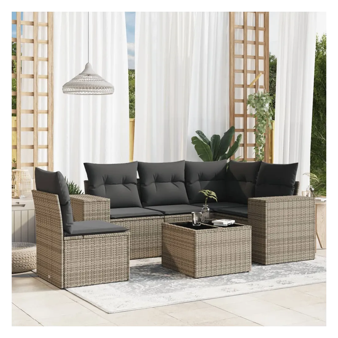 Salon de jardin 6 pcs avec coussins gris résine tressée