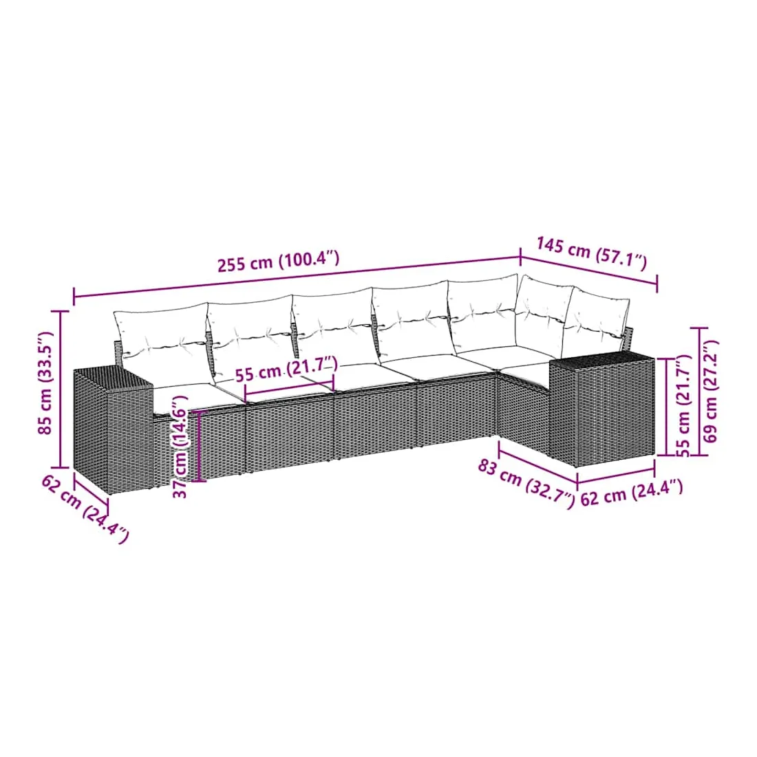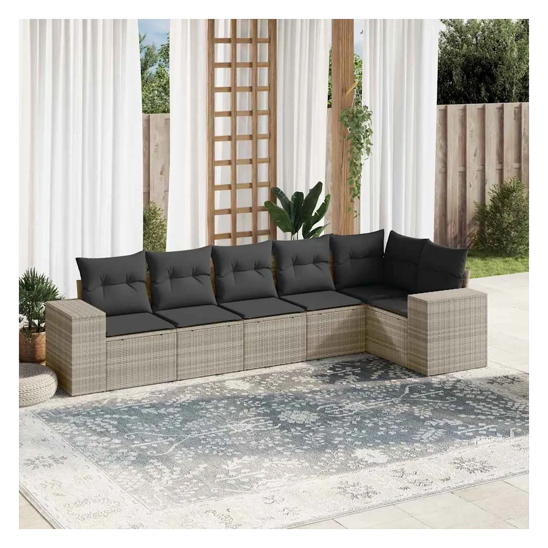 Cet ensemble de canapés de jardin est le complément parfait de votre arrière-cour, terrasse ou patio, offrant un espace confortable et accueillant pour discuter avec la famille et les amis ou simplement se détendre et profiter de l'extérieur. Matériau durable : la résine tressée, également connue sous le nom de poly rotin, est un matériau synthétique solide et nécessitant peu d'entretien qui ressemble au rotin naturel. Il est léger, facile à nettoyer et couramment utilisé pour les meubles d'extérieur en raison de sa durabilité et de ses propriétés de résistance aux intempéries.Fonction de rangement avec sac résistant à l'eau : le mobilier de jardin dispose d'un espace de rangement sous l'assise, complété par un sac résistant à l'eau pour ranger coussins, jouets et autres objets. Le sac intérieur peut être solidement fixé au mobilier d'extérieur grâce à des attaches auto-agrippantes pour plus de stabilité.Housse amovible et lavable : ces coussins de siège sont dotés de housses amovibles pour un lavage et un entretien faciles.Conception modulaire : cet ensemble de meubles d'extérieur a une conception modulaire, ce qui le rend complètement flexible et facile à déplacer, afin que vous puissiez créer un agencement de meubles d'extérieur personnalisé. Bon à savoir :Pour que vos meubles d'extérieur restent beaux, nous vous recommandons de les protéger avec une housse imperméable.