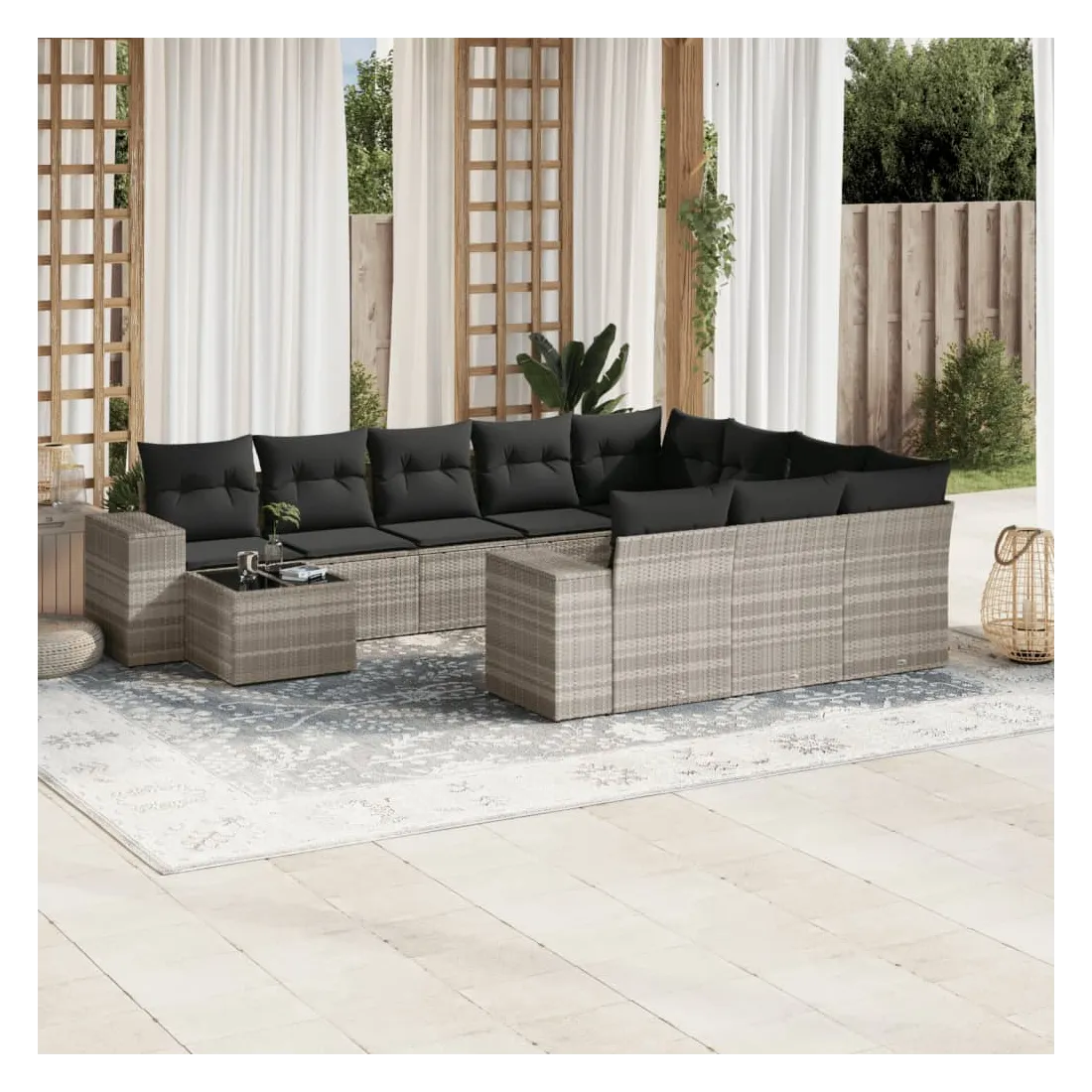 Cet ensemble de canapés de jardin est le complément parfait de votre arrière-cour, terrasse ou patio, offrant un espace confortable et accueillant pour discuter avec la famille et les amis ou simplement se détendre et profiter de l'extérieur. Matériau durable : la résine tressée, également connue sous le nom de poly rotin, est un matériau synthétique solide et nécessitant peu d'entretien qui ressemble au rotin naturel. Il est léger, facile à nettoyer et couramment utilisé pour les meubles d'extérieur en raison de sa durabilité et de ses propriétés de résistance aux intempéries.Fonction de rangement avec sac résistant à l'eau : le mobilier de jardin dispose d'un espace de rangement sous l'assise, complété par un sac résistant à l'eau pour ranger coussins, jouets et autres objets. Le sac intérieur peut être solidement fixé au mobilier d'extérieur grâce à des attaches auto-agrippantes pour plus de stabilité.Dessus en verre : le dessus de la table d'extérieur est fabriqué en verre trempé solide et durable, ce qui le rend facile à nettoyer avec un chiffon humide et ajoute une touche d'élégance à votre espace extérieur.Housse amovible et lavable : ces coussins de siège sont dotés de housses amovibles pour un lavage et un entretien faciles.Conception modulaire : cet ensemble de meubles d'extérieur a une conception modulaire, ce qui le rend complètement flexible et facile à déplacer, afin que vous puissiez créer un agencement de meubles d'extérieur personnalisé. Bon à savoir :Pour que vos meubles d'extérieur restent beaux, nous vous recommandons de les protéger avec une housse imperméable.