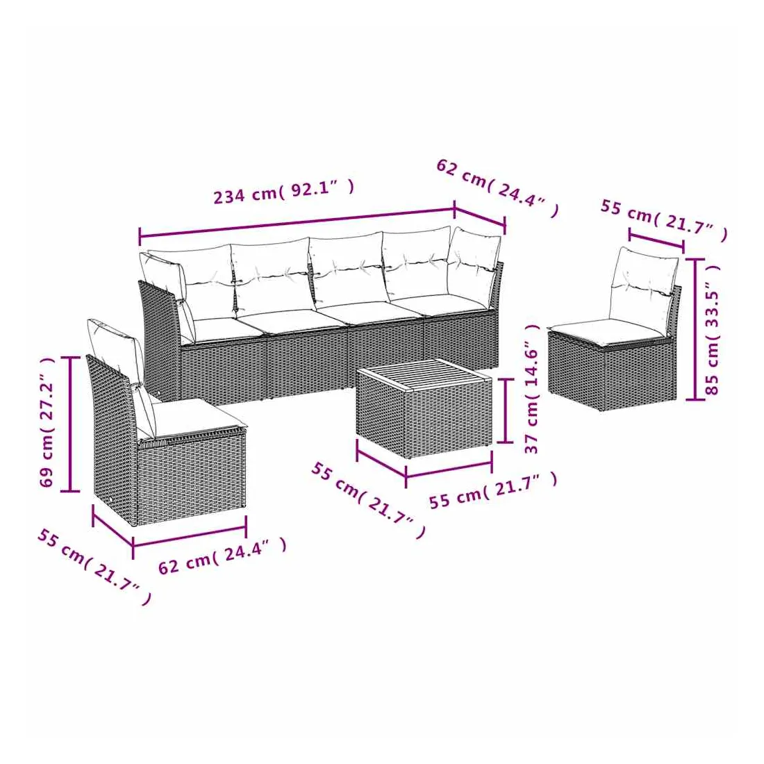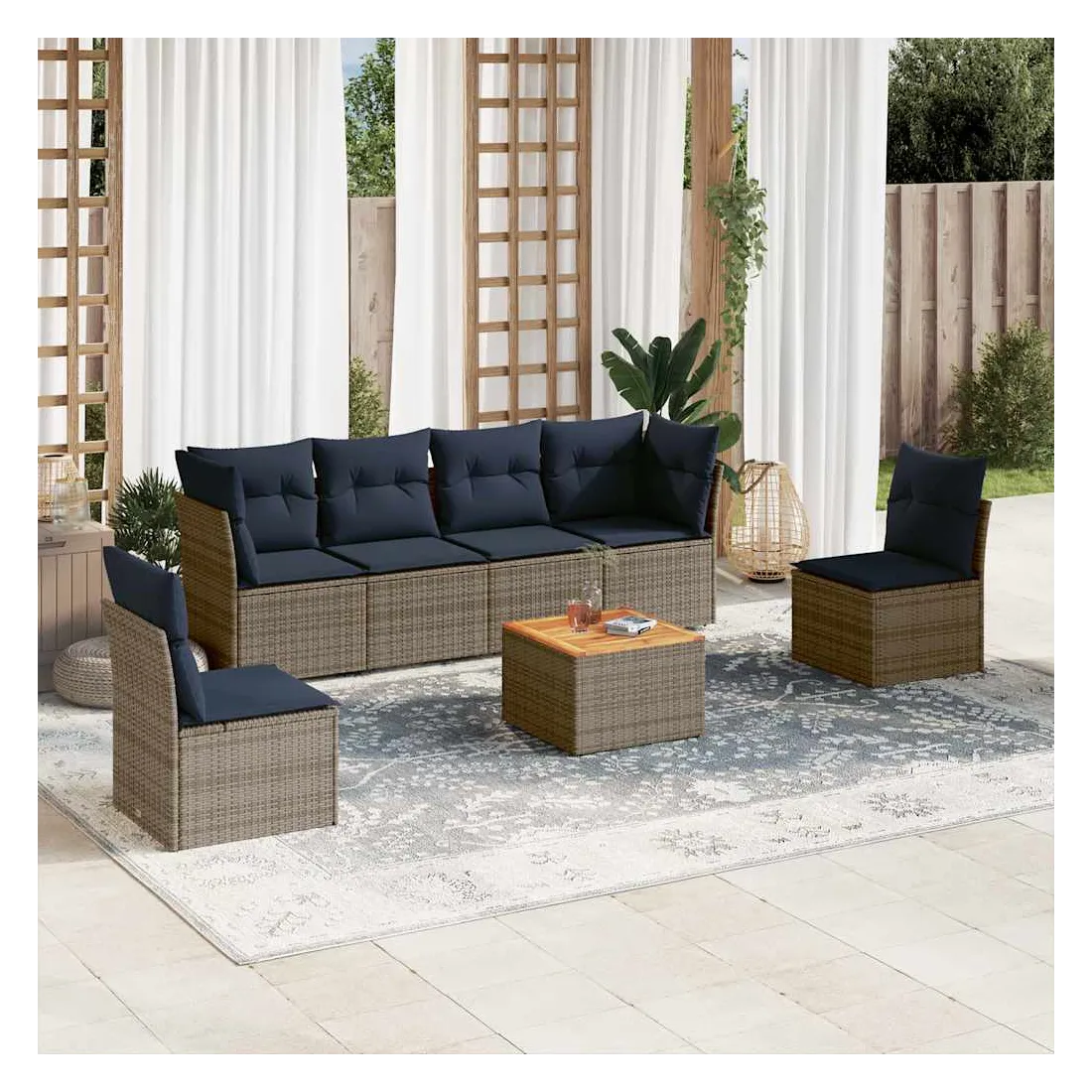 Cet ensemble de canapés de jardin est le complément parfait de votre arrière-cour, terrasse ou patio, offrant un espace confortable et accueillant pour discuter avec la famille et les amis ou simplement se détendre et profiter de l'extérieur. Matériau durable : la résine tressée, également connue sous le nom de poly rotin, est un matériau synthétique solide et nécessitant peu d'entretien qui ressemble au rotin naturel. Il est léger, facile à nettoyer et couramment utilisé pour les meubles d'extérieur en raison de sa durabilité et de ses propriétés de résistance aux intempéries.Fonction de rangement avec sac résistant à l'eau : chaque siège de jardin dispose d'un espace de rangement sous l'assise, complété par un sac résistant à l'eau pour ranger les coussins, les jouets et d'autres objets. Les sacs intérieurs sont dotés d'un couvercle et peuvent être solidement fixés aux sièges à l'aide de bandes auto-agrippantes pour plus de stabilité.Dessus stable et facile à nettoyer : cette table de jardin a un dessus en bois d'acacia robuste, durable et facile à nettoyer avec un chiffon humide.Housse amovible et lavable : ces coussins de siège sont dotés de housses amovibles pour un lavage et un entretien faciles.Conception modulaire : cet ensemble de meubles d'extérieur a une conception modulaire, ce qui le rend complètement flexible et facile à déplacer, afin que vous puissiez créer un agencement de meubles d'extérieur personnalisé. Bon à savoir :Pour que vos meubles d'extérieur restent beaux, nous vous recommandons de les protéger avec une housse imperméable.
