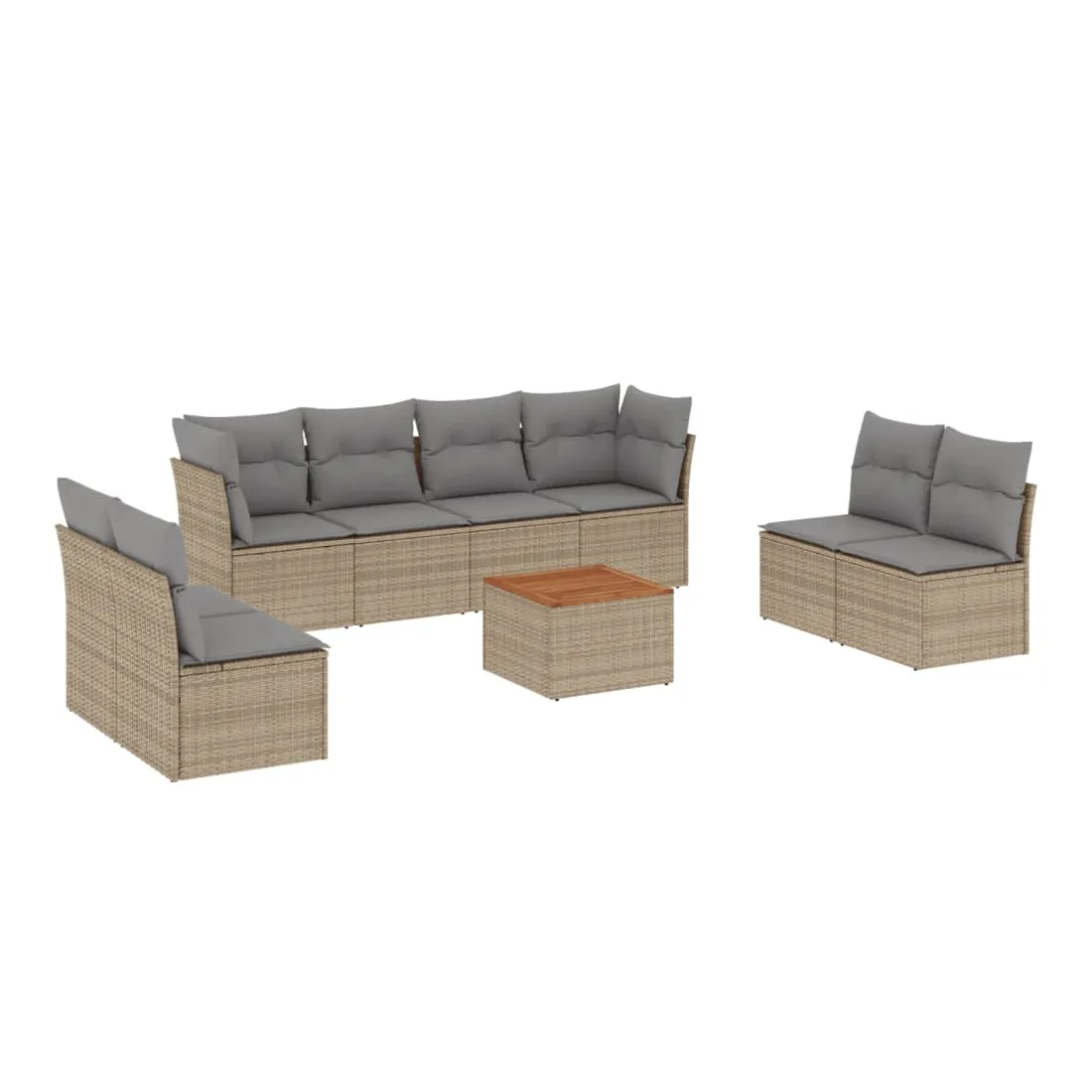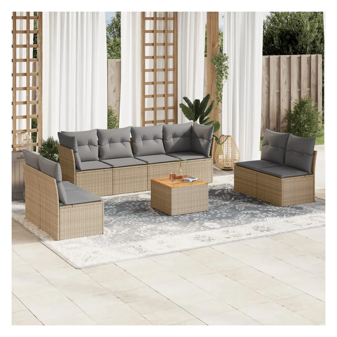 Cet ensemble de canapés de jardin est le complément parfait de votre arrière-cour, terrasse ou patio, offrant un espace confortable et accueillant pour discuter avec la famille et les amis ou simplement se détendre et profiter de l'extérieur. Matériau durable : la résine tressée, également connue sous le nom de poly rotin, est un matériau synthétique solide et nécessitant peu d'entretien qui ressemble au rotin naturel. Il est léger, facile à nettoyer et couramment utilisé pour les meubles d'extérieur en raison de sa durabilité et de ses propriétés de résistance aux intempéries.Fonction de rangement avec sac résistant à l'eau : chaque siège de jardin dispose d'un espace de rangement sous l'assise, complété par un sac résistant à l'eau pour ranger les coussins, les jouets et d'autres objets. Les sacs intérieurs sont dotés d'un couvercle et peuvent être solidement fixés aux sièges à l'aide de bandes auto-agrippantes pour plus de stabilité.Dessus stable et facile à nettoyer : cette table de jardin a un dessus en bois d'acacia robuste, durable et facile à nettoyer avec un chiffon humide.Housse amovible et lavable : ces coussins de siège sont dotés de housses amovibles pour un lavage et un entretien faciles.Conception modulaire : cet ensemble de meubles d'extérieur a une conception modulaire, ce qui le rend complètement flexible et facile à déplacer, afin que vous puissiez créer un agencement de meubles d'extérieur personnalisé. Bon à savoir :Pour que vos meubles d'extérieur restent beaux, nous vous recommandons de les protéger avec une housse imperméable.