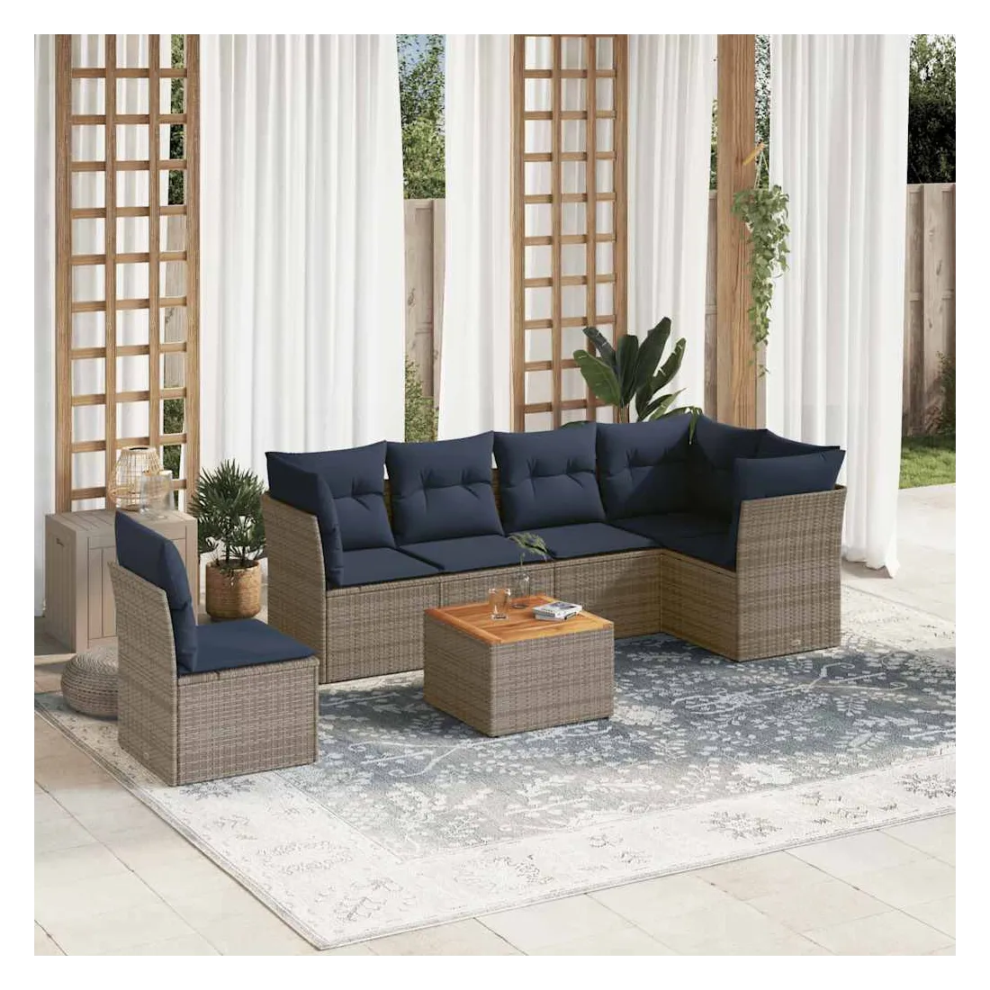 Cet ensemble de canapés de jardin est le complément parfait de votre arrière-cour, terrasse ou patio, offrant un espace confortable et accueillant pour discuter avec la famille et les amis ou simplement se détendre et profiter de l'extérieur. Matériau durable : la résine tressée, également connue sous le nom de poly rotin, est un matériau synthétique solide et nécessitant peu d'entretien qui ressemble au rotin naturel. Il est léger, facile à nettoyer et couramment utilisé pour les meubles d'extérieur en raison de sa durabilité et de ses propriétés de résistance aux intempéries.Fonction de rangement avec sac résistant à l'eau : chaque siège de jardin dispose d'un espace de rangement sous l'assise, complété par un sac résistant à l'eau pour ranger les coussins, les jouets et d'autres objets. Les sacs intérieurs sont dotés d'un couvercle et peuvent être solidement fixés aux sièges à l'aide de bandes auto-agrippantes pour plus de stabilité.Dessus stable et facile à nettoyer : cette table de jardin a un dessus en bois d'acacia robuste, durable et facile à nettoyer avec un chiffon humide.Housse amovible et lavable : ces coussins de siège sont dotés de housses amovibles pour un lavage et un entretien faciles.Conception modulaire : cet ensemble de meubles d'extérieur a une conception modulaire, ce qui le rend complètement flexible et facile à déplacer, afin que vous puissiez créer un agencement de meubles d'extérieur personnalisé. Bon à savoir :Pour que vos meubles d'extérieur restent beaux, nous vous recommandons de les protéger avec une housse imperméable.