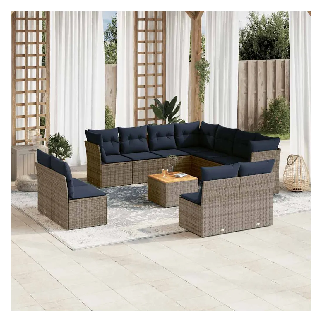 Cet ensemble de canapés de jardin est le complément parfait de votre arrière-cour, terrasse ou patio, offrant un espace confortable et accueillant pour discuter avec la famille et les amis ou simplement se détendre et profiter de l'extérieur. Matériau durable : la résine tressée, également connue sous le nom de poly rotin, est un matériau synthétique solide et nécessitant peu d'entretien qui ressemble au rotin naturel. Il est léger, facile à nettoyer et couramment utilisé pour les meubles d'extérieur en raison de sa durabilité et de ses propriétés de résistance aux intempéries.Fonction de rangement avec sac résistant à l'eau : chaque siège de jardin dispose d'un espace de rangement sous l'assise, complété par un sac résistant à l'eau pour ranger les coussins, les jouets et d'autres objets. Les sacs intérieurs sont dotés d'un couvercle et peuvent être solidement fixés aux sièges à l'aide de bandes auto-agrippantes pour plus de stabilité.Dessus stable et facile à nettoyer : cette table de jardin a un dessus en bois d'acacia robuste, durable et facile à nettoyer avec un chiffon humide.Housse amovible et lavable : ces coussins de siège sont dotés de housses amovibles pour un lavage et un entretien faciles.Conception modulaire : cet ensemble de meubles d'extérieur a une conception modulaire, ce qui le rend complètement flexible et facile à déplacer, afin que vous puissiez créer un agencement de meubles d'extérieur personnalisé. Bon à savoir :Pour que vos meubles d'extérieur restent beaux, nous vous recommandons de les protéger avec une housse imperméable.