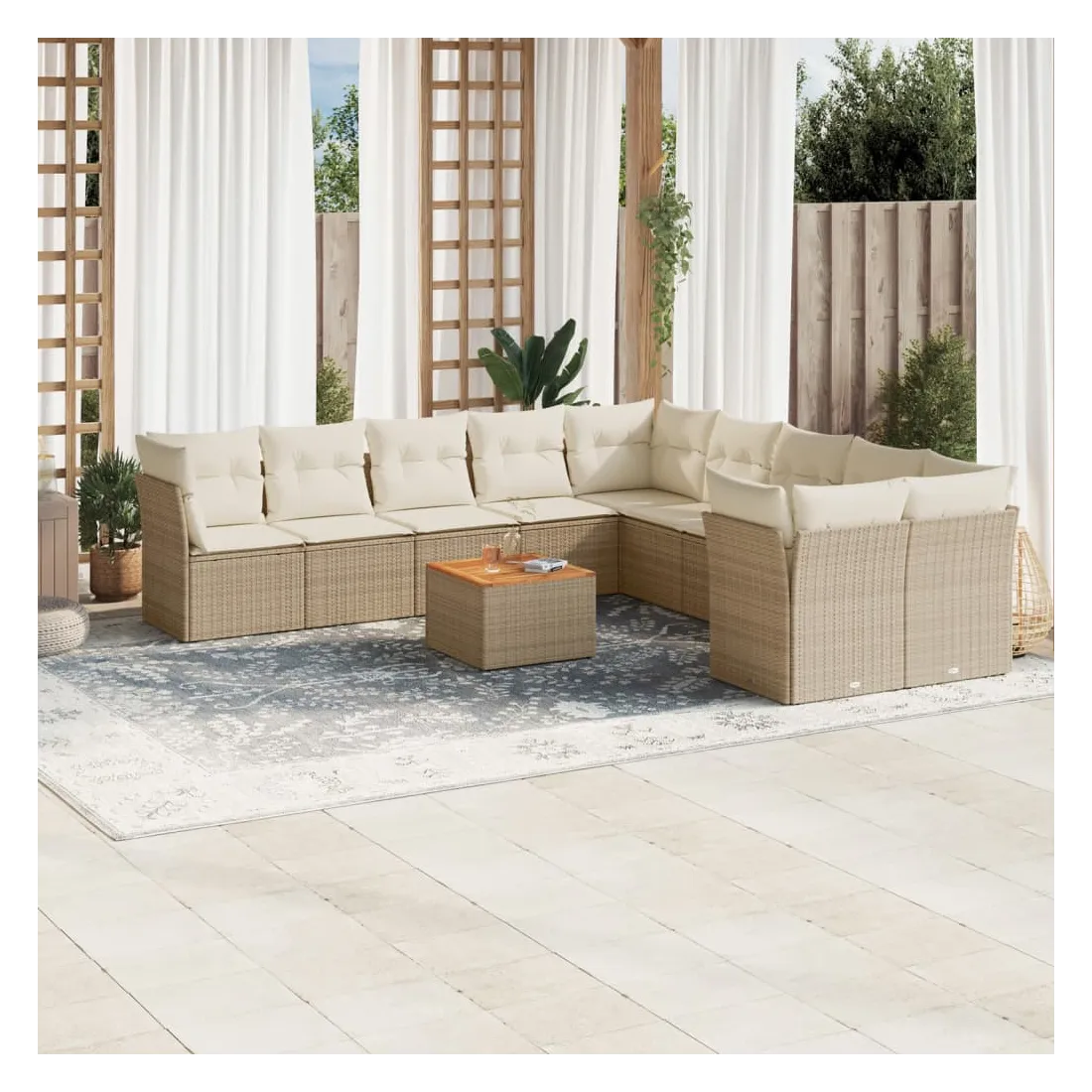 Cet ensemble de canapés de jardin est le complément parfait de votre arrière-cour, terrasse ou patio, offrant un espace confortable et accueillant pour discuter avec la famille et les amis ou simplement se détendre et profiter de l'extérieur. Matériau durable : la résine tressée, également connue sous le nom de poly rotin, est un matériau synthétique solide et nécessitant peu d'entretien qui ressemble au rotin naturel. Il est léger, facile à nettoyer et couramment utilisé pour les meubles d'extérieur en raison de sa durabilité et de ses propriétés de résistance aux intempéries.Fonction de rangement avec sac résistant à l'eau : chaque siège de jardin dispose d'un espace de rangement sous l'assise, complété par un sac résistant à l'eau pour ranger les coussins, les jouets et d'autres objets. Les sacs intérieurs sont dotés d'un couvercle et peuvent être solidement fixés aux sièges à l'aide de bandes auto-agrippantes pour plus de stabilité.Dessus stable et facile à nettoyer : cette table de jardin a un dessus en bois d'acacia robuste, durable et facile à nettoyer avec un chiffon humide.Housse amovible et lavable : ces coussins de siège sont dotés de housses amovibles pour un lavage et un entretien faciles.Conception modulaire : cet ensemble de meubles d'extérieur a une conception modulaire, ce qui le rend complètement flexible et facile à déplacer, afin que vous puissiez créer un agencement de meubles d'extérieur personnalisé. Bon à savoir :Pour que vos meubles d'extérieur restent beaux, nous vous recommandons de les protéger avec une housse imperméable.