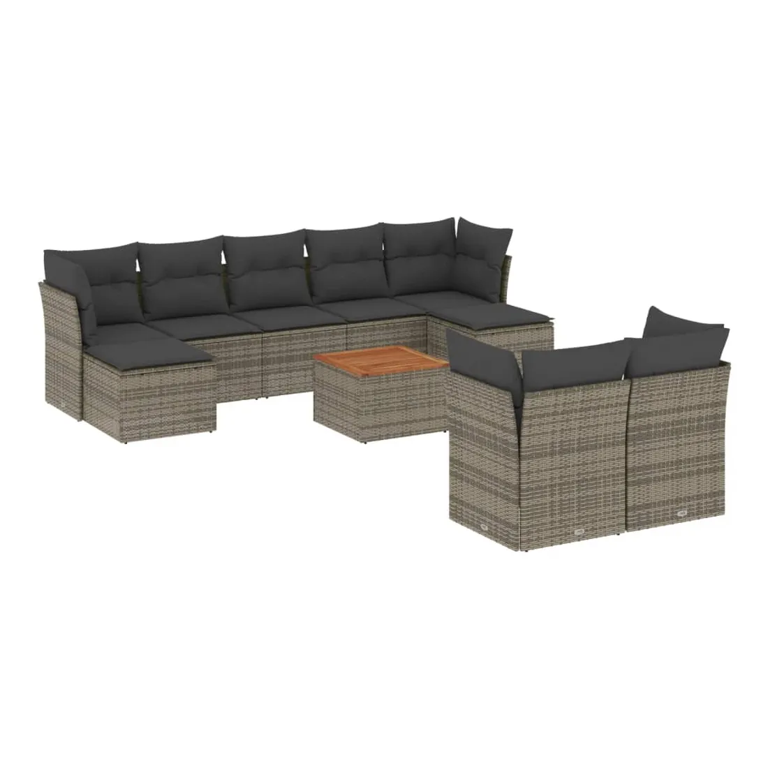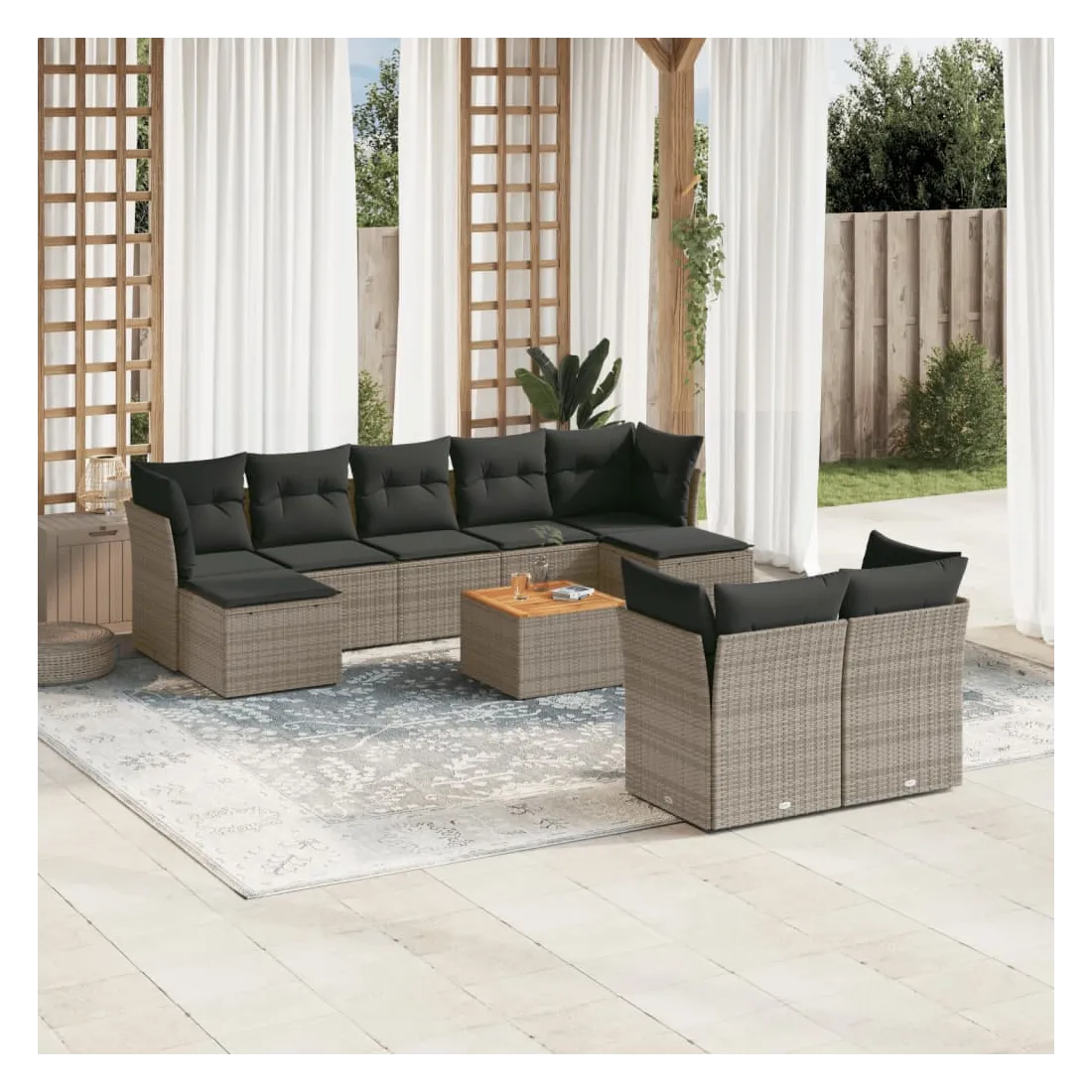 Cet ensemble de canapés de jardin est le complément parfait de votre arrière-cour, terrasse ou patio, offrant un espace confortable et accueillant pour discuter avec la famille et les amis ou simplement se détendre et profiter de l'extérieur. Matériau durable : la résine tressée, également connue sous le nom de poly rotin, est un matériau synthétique solide et nécessitant peu d'entretien qui ressemble au rotin naturel. Il est léger, facile à nettoyer et couramment utilisé pour les meubles d'extérieur en raison de sa durabilité et de ses propriétés de résistance aux intempéries.Fonction de rangement avec sac résistant à l'eau : chaque siège de jardin dispose d'un espace de rangement sous l'assise, complété par un sac résistant à l'eau pour ranger les coussins, les jouets et d'autres objets. Les sacs intérieurs sont dotés d'un couvercle et peuvent être solidement fixés aux sièges à l'aide de bandes auto-agrippantes pour plus de stabilité.Dessus stable et facile à nettoyer : cette table de jardin a un dessus en bois d'acacia robuste, durable et facile à nettoyer avec un chiffon humide.Pouf polyvalent : le tabouret est polyvalent, servant de repose-pieds confortable lorsque vous vous prélassez sur le canapé ou de siège supplémentaire dans votre jardin.Conception modulaire : cet ensemble de meubles d'extérieur a une conception modulaire, ce qui le rend complètement flexible et facile à déplacer, afin que vous puissiez créer un agencement de meubles d'extérieur personnalisé. Bon à savoir :Pour que vos meubles d'extérieur restent beaux, nous vous recommandons de les protéger avec une housse imperméable.