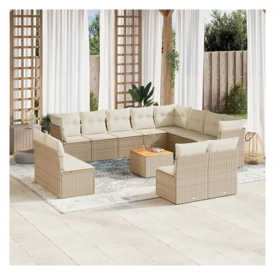 Cet ensemble de canapés de jardin est le complément parfait de votre arrière-cour, terrasse ou patio, offrant un espace confortable et accueillant pour discuter avec la famille et les amis ou simplement se détendre et profiter de l'extérieur. Matériau durable : la résine tressée, également connue sous le nom de poly rotin, est un matériau synthétique solide et nécessitant peu d'entretien qui ressemble au rotin naturel. Il est léger, facile à nettoyer et couramment utilisé pour les meubles d'extérieur en raison de sa durabilité et de ses propriétés de résistance aux intempéries.Fonction de rangement avec sac résistant à l'eau : chaque siège de jardin dispose d'un espace de rangement sous l'assise, complété par un sac résistant à l'eau pour ranger les coussins, les jouets et d'autres objets. Les sacs intérieurs sont dotés d'un couvercle et peuvent être solidement fixés aux sièges à l'aide de bandes auto-agrippantes pour plus de stabilité.Dessus stable et facile à nettoyer : cette table de jardin a un dessus en bois d'acacia robuste, durable et facile à nettoyer avec un chiffon humide.Housse amovible et lavable : ces coussins de siège sont dotés de housses amovibles pour un lavage et un entretien faciles.Conception modulaire : cet ensemble de meubles d'extérieur a une conception modulaire, ce qui le rend complètement flexible et facile à déplacer, afin que vous puissiez créer un agencement de meubles d'extérieur personnalisé. Bon à savoir :Pour que vos meubles d'extérieur restent beaux, nous vous recommandons de les protéger avec une housse imperméable.