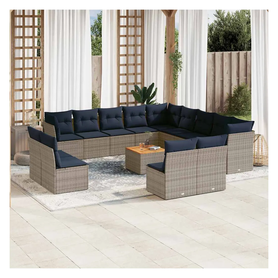 Cet ensemble de canapés de jardin est le complément parfait de votre arrière-cour, terrasse ou patio, offrant un espace confortable et accueillant pour discuter avec la famille et les amis ou simplement se détendre et profiter de l'extérieur. Matériau durable : la résine tressée, également connue sous le nom de poly rotin, est un matériau synthétique solide et nécessitant peu d'entretien qui ressemble au rotin naturel. Il est léger, facile à nettoyer et couramment utilisé pour les meubles d'extérieur en raison de sa durabilité et de ses propriétés de résistance aux intempéries.Fonction de rangement avec sac résistant à l'eau : chaque siège de jardin dispose d'un espace de rangement sous l'assise, complété par un sac résistant à l'eau pour ranger les coussins, les jouets et d'autres objets. Les sacs intérieurs sont dotés d'un couvercle et peuvent être solidement fixés aux sièges à l'aide de bandes auto-agrippantes pour plus de stabilité.Dessus stable et facile à nettoyer : cette table de jardin a un dessus en bois d'acacia robuste, durable et facile à nettoyer avec un chiffon humide.Housse amovible et lavable : ces coussins de siège sont dotés de housses amovibles pour un lavage et un entretien faciles.Conception modulaire : cet ensemble de meubles d'extérieur a une conception modulaire, ce qui le rend complètement flexible et facile à déplacer, afin que vous puissiez créer un agencement de meubles d'extérieur personnalisé. Bon à savoir :Pour que vos meubles d'extérieur restent beaux, nous vous recommandons de les protéger avec une housse imperméable.