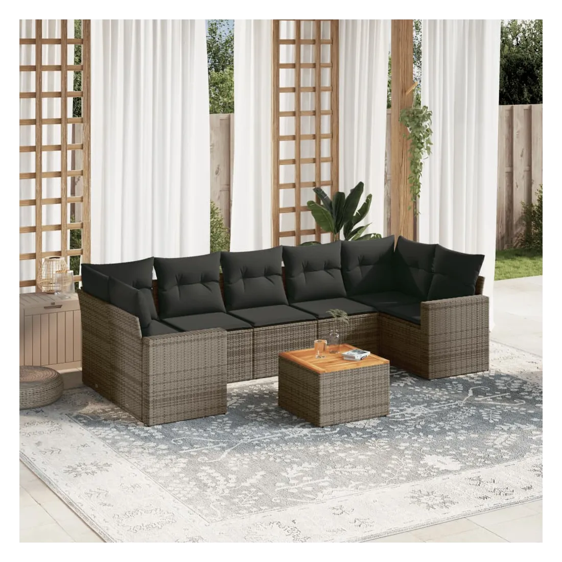 Cet ensemble de canapés de jardin est le complément parfait de votre arrière-cour, terrasse ou patio, offrant un espace confortable et accueillant pour discuter avec la famille et les amis ou simplement se détendre et profiter de l'extérieur. Matériau durable : la résine tressée, également connue sous le nom de poly rotin, est un matériau synthétique solide et nécessitant peu d'entretien qui ressemble au rotin naturel. Il est léger, facile à nettoyer et couramment utilisé pour les meubles d'extérieur en raison de sa durabilité et de ses propriétés de résistance aux intempéries.Fonction de rangement avec sac résistant à l'eau : chaque siège de jardin dispose d'un espace de rangement sous l'assise, complété par un sac résistant à l'eau pour ranger les coussins, les jouets et d'autres objets. Les sacs intérieurs sont dotés d'un couvercle et peuvent être solidement fixés aux sièges à l'aide de bandes auto-agrippantes pour plus de stabilité.Dessus stable et facile à nettoyer : cette table de jardin a un dessus en bois d'acacia robuste, durable et facile à nettoyer avec un chiffon humide.Housse amovible et lavable : ces coussins de siège sont dotés de housses amovibles pour un lavage et un entretien faciles.Conception modulaire : cet ensemble de meubles d'extérieur a une conception modulaire, ce qui le rend complètement flexible et facile à déplacer, afin que vous puissiez créer un agencement de meubles d'extérieur personnalisé. Bon à savoir :Pour que vos meubles d'extérieur restent beaux, nous vous recommandons de les protéger avec une housse imperméable.