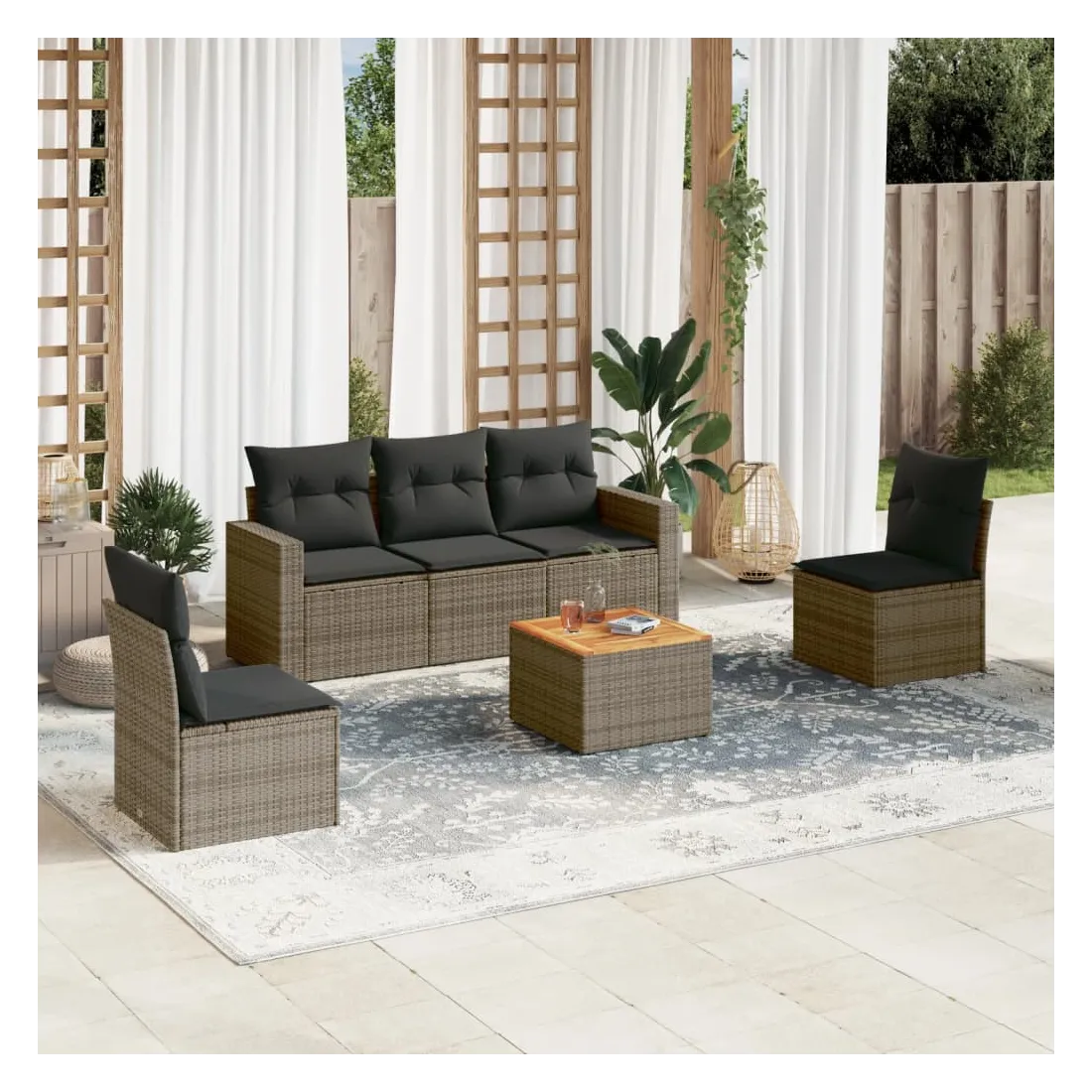 Cet ensemble de canapés de jardin est le complément parfait de votre arrière-cour, terrasse ou patio, offrant un espace confortable et accueillant pour discuter avec la famille et les amis ou simplement se détendre et profiter de l'extérieur. Matériau durable : la résine tressée, également connue sous le nom de poly rotin, est un matériau synthétique solide et nécessitant peu d'entretien qui ressemble au rotin naturel. Il est léger, facile à nettoyer et couramment utilisé pour les meubles d'extérieur en raison de sa durabilité et de ses propriétés de résistance aux intempéries.Fonction de rangement avec sac résistant à l'eau : chaque siège de jardin dispose d'un espace de rangement sous l'assise, complété par un sac résistant à l'eau pour ranger les coussins, les jouets et d'autres objets. Les sacs intérieurs sont dotés d'un couvercle et peuvent être solidement fixés aux sièges à l'aide de bandes auto-agrippantes pour plus de stabilité.Dessus stable et facile à nettoyer : cette table de jardin a un dessus en bois d'acacia robuste, durable et facile à nettoyer avec un chiffon humide.Housse amovible et lavable : ces coussins de siège sont dotés de housses amovibles pour un lavage et un entretien faciles.Conception modulaire : cet ensemble de meubles d'extérieur a une conception modulaire, ce qui le rend complètement flexible et facile à déplacer, afin que vous puissiez créer un agencement de meubles d'extérieur personnalisé. Bon à savoir :Pour que vos meubles d'extérieur restent beaux, nous vous recommandons de les protéger avec une housse imperméable.