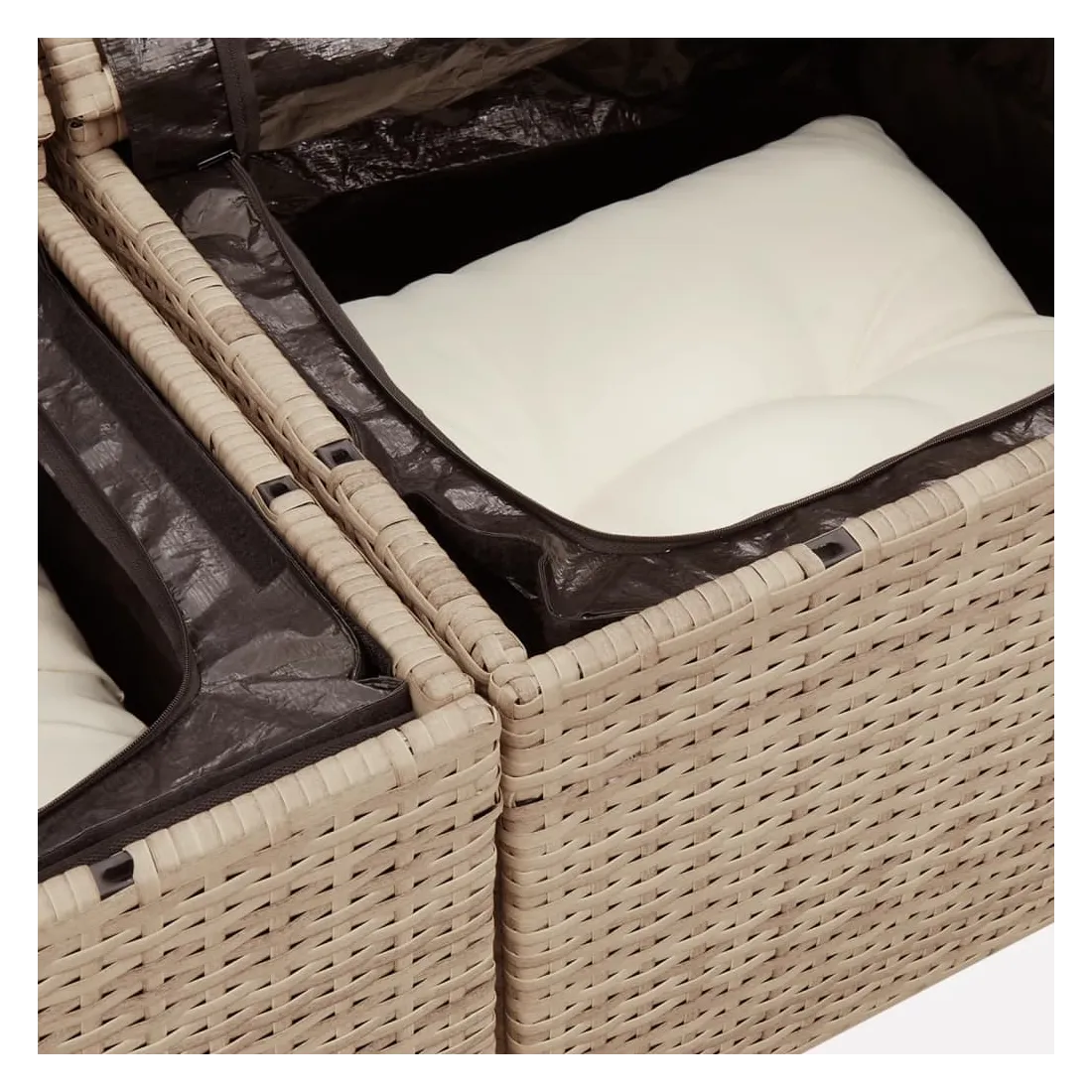 Cet ensemble de canapés de jardin est le complément parfait de votre arrière-cour, terrasse ou patio, offrant un espace confortable et accueillant pour discuter avec la famille et les amis ou simplement se détendre et profiter de l'extérieur. Matériau durable : la résine tressée, également connue sous le nom de poly rotin, est un matériau synthétique solide et nécessitant peu d'entretien qui ressemble au rotin naturel. Il est léger, facile à nettoyer et couramment utilisé pour les meubles d'extérieur en raison de sa durabilité et de ses propriétés de résistance aux intempéries.Fonction de rangement avec sac résistant à l'eau : chaque siège de jardin dispose d'un espace de rangement sous l'assise, complété par un sac résistant à l'eau pour ranger les coussins, les jouets et d'autres objets. Les sacs intérieurs sont dotés d'un couvercle et peuvent être solidement fixés aux sièges à l'aide de bandes auto-agrippantes pour plus de stabilité.Dessus stable et facile à nettoyer : cette table de jardin a un dessus en bois d'acacia robuste, durable et facile à nettoyer avec un chiffon humide.Housse amovible et lavable : ces coussins de siège sont dotés de housses amovibles pour un lavage et un entretien faciles.Conception modulaire : cet ensemble de meubles d'extérieur a une conception modulaire, ce qui le rend complètement flexible et facile à déplacer, afin que vous puissiez créer un agencement de meubles d'extérieur personnalisé. Bon à savoir :Pour que vos meubles d'extérieur restent beaux, nous vous recommandons de les protéger avec une housse imperméable.