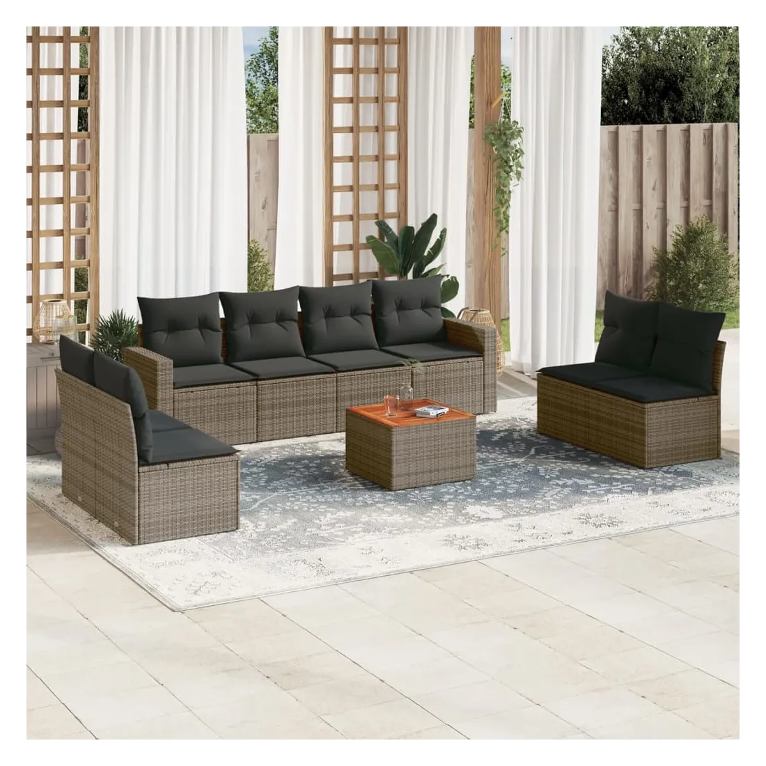 Cet ensemble de canapés de jardin est le complément parfait de votre arrière-cour, terrasse ou patio, offrant un espace confortable et accueillant pour discuter avec la famille et les amis ou simplement se détendre et profiter de l'extérieur. Matériau durable : la résine tressée, également connue sous le nom de poly rotin, est un matériau synthétique solide et nécessitant peu d'entretien qui ressemble au rotin naturel. Il est léger, facile à nettoyer et couramment utilisé pour les meubles d'extérieur en raison de sa durabilité et de ses propriétés de résistance aux intempéries.Fonction de rangement avec sac résistant à l'eau : chaque siège de jardin dispose d'un espace de rangement sous l'assise, complété par un sac résistant à l'eau pour ranger les coussins, les jouets et d'autres objets. Les sacs intérieurs sont dotés d'un couvercle et peuvent être solidement fixés aux sièges à l'aide de bandes auto-agrippantes pour plus de stabilité.Dessus stable et facile à nettoyer : cette table de jardin a un dessus en bois d'acacia robuste, durable et facile à nettoyer avec un chiffon humide.Housse amovible et lavable : ces coussins de siège sont dotés de housses amovibles pour un lavage et un entretien faciles.Conception modulaire : cet ensemble de meubles d'extérieur a une conception modulaire, ce qui le rend complètement flexible et facile à déplacer, afin que vous puissiez créer un agencement de meubles d'extérieur personnalisé. Bon à savoir :Pour que vos meubles d'extérieur restent beaux, nous vous recommandons de les protéger avec une housse imperméable.