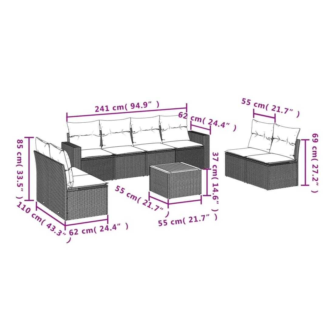 - 8 x coussin d'assise avec housse amovible et lavable